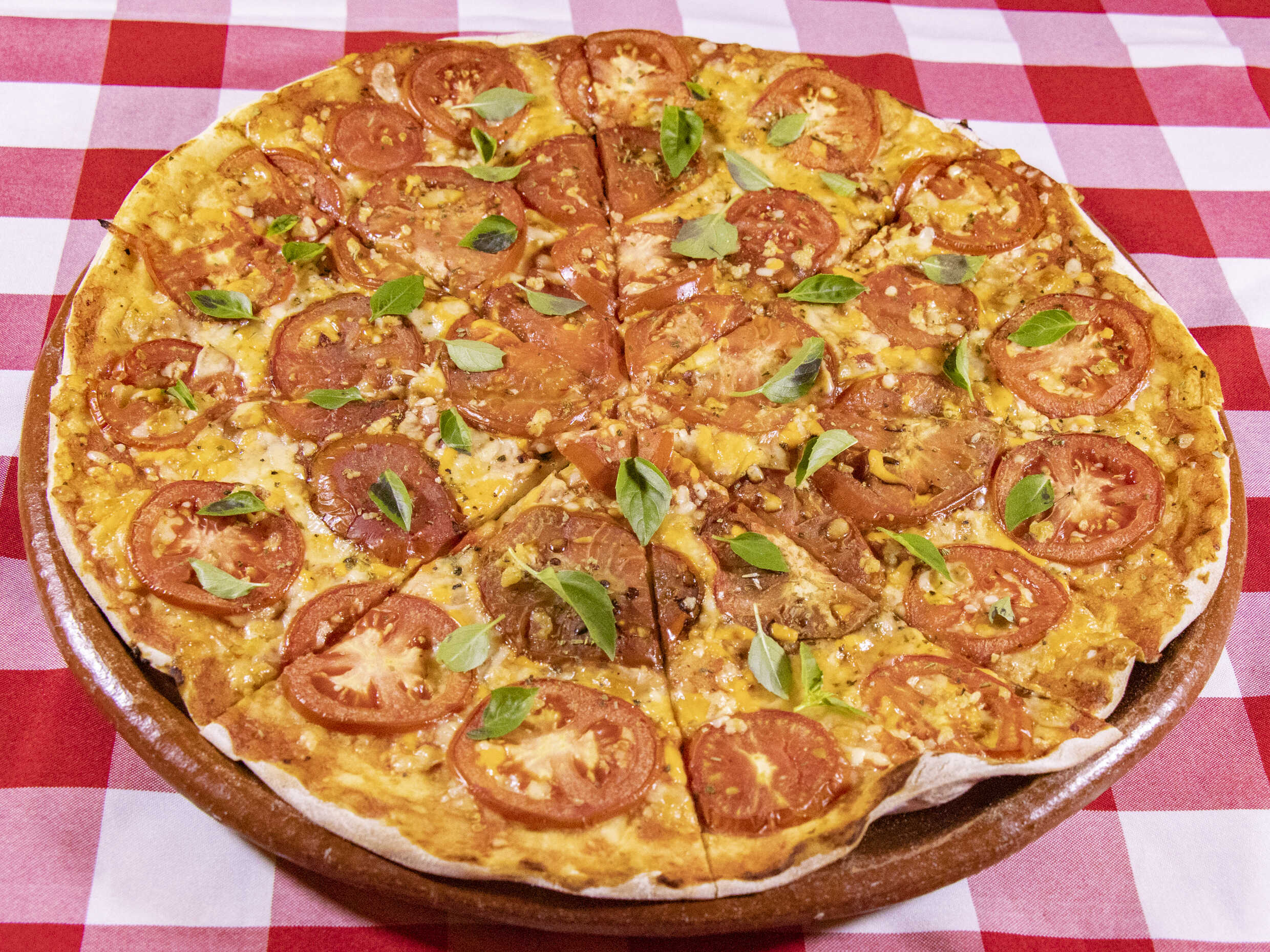 Base delgada tradicional 35 cms aproximadamente, mezcla de quesos, salsa de tomate italiano, tomate, ajo y albahaca fresca.