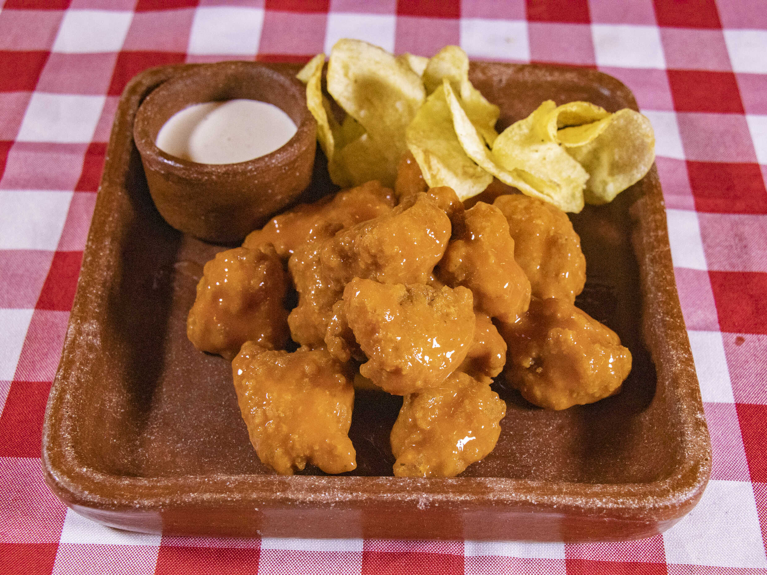Trozos de pollo, empanizados y fritos, sazonados con salsa a elección, acompañados de aderezo ranch y papas chips naturales.