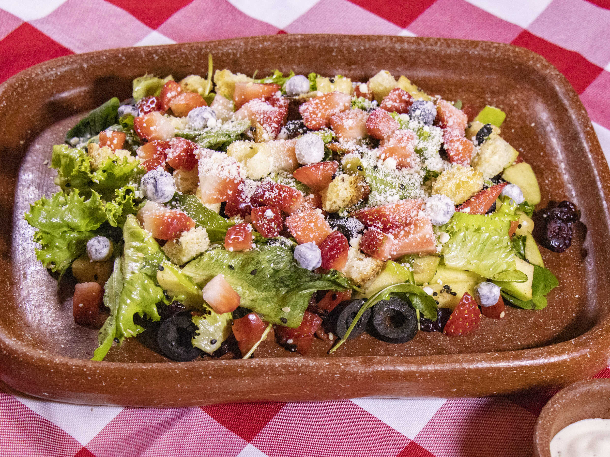 Lechuga italiana, arúgula, espinaca, fresas, arándanos, manzana verde, aceitunas negras, pimiento, ajonjolí, semilla de girasol, queso parmesano, crutones y aderezo ranch.