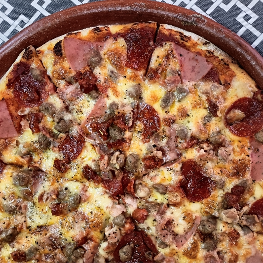 Base delgada tradicional 35 cms aproximadamente, mezcla de quesos, salsa de tomate italiano, chistorra, jamón, salchicha argentina, tocino y pepperoni.