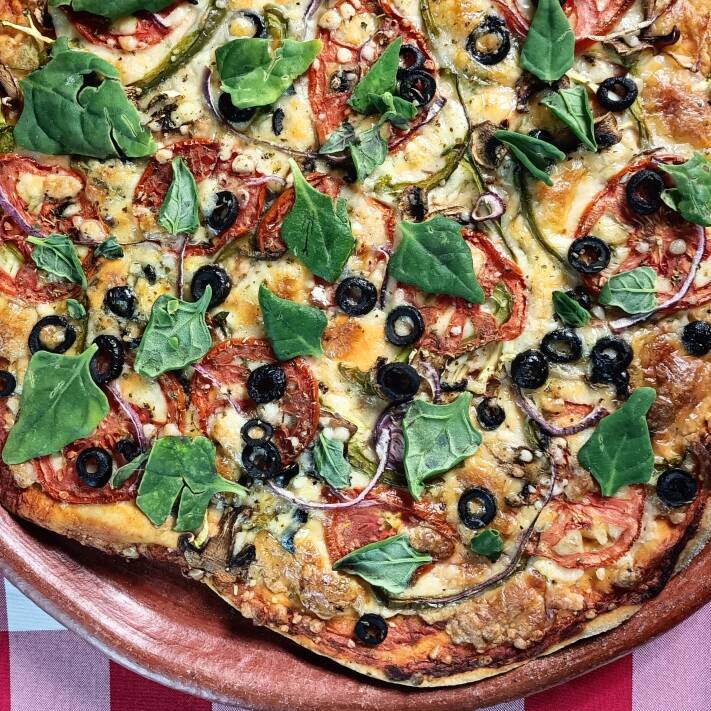 Base delgada tradicional 35 cms aproximadamente, mezcla de quesos, salsa de tomate italiano, calabaza, berenjena, champiñones, cebolla, pimiento, tomate, espinaca y aceitunas.