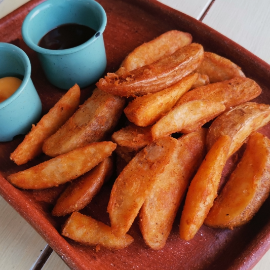 Rebanadas de papa con cascara, sazonadas y fritas. Acompañadas de cátsup y queso amarillo.