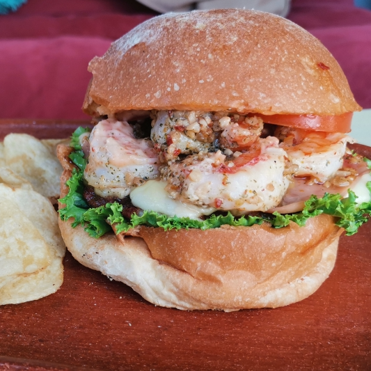 150 Grs de carne, camarones salteados con vino blanco y ajo, mayonesa, mostaza, cátsup, aderezo chipotle, mezcla de quesos, jamón, lechuga, cebolla, pepinillos y tomate.