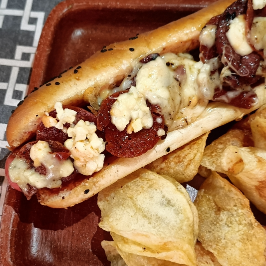 Pan artesanal, salchicha jumbo, mayonesa, mostaza, cátsup, pepperoni, salami y mezcla de quesos.