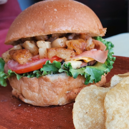 150 Grs de carne, mayonesa, mostaza, cátsup, mezcla de quesos, jamón, lechuga, cebolla, pepinillos, piña asada y tomate.