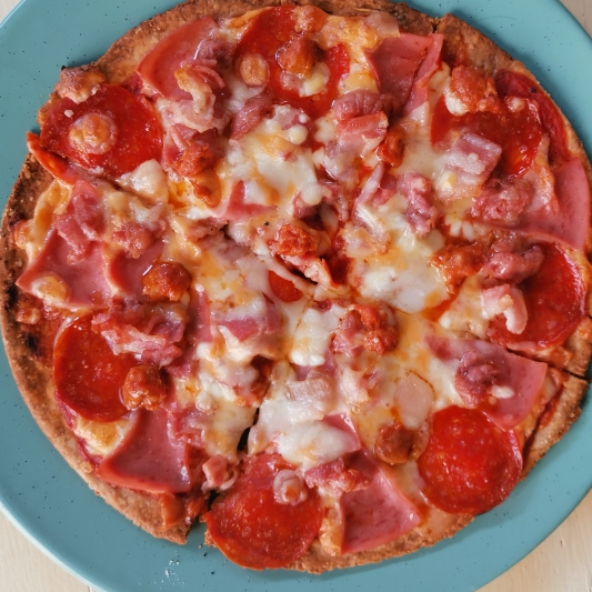 Base de avena con harina integral 23 cms aproximadamente, mezcla de quesos, salsa de tomate italiano, chorizo español, jamón, salchicha argentina, tocino y pepperoni.