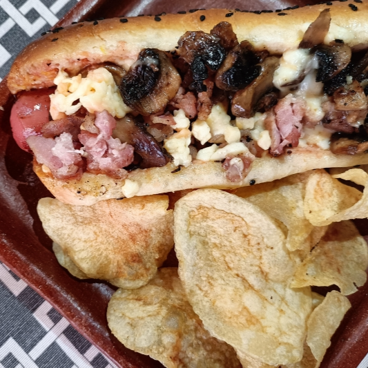 Pan artesanal, salchicha jumbo, mayonesa, mostaza, cátsup, champiñones, tocino y mezcla de quesos.