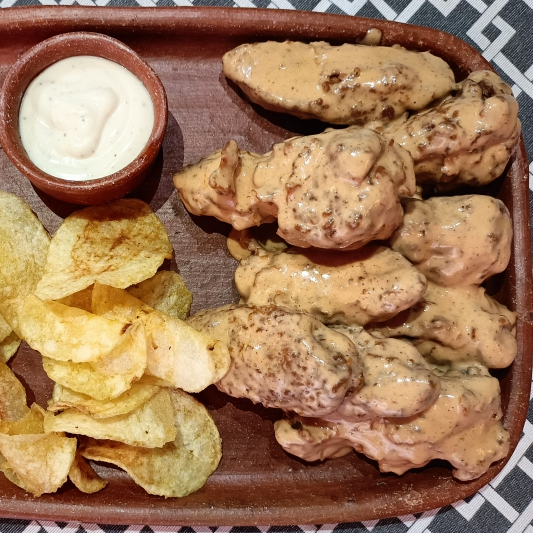 Alitas de pollo fritas, sazonadas y aderezadas con salsa a elección, acompañadas de aderezo ranch y papas chips naturales.