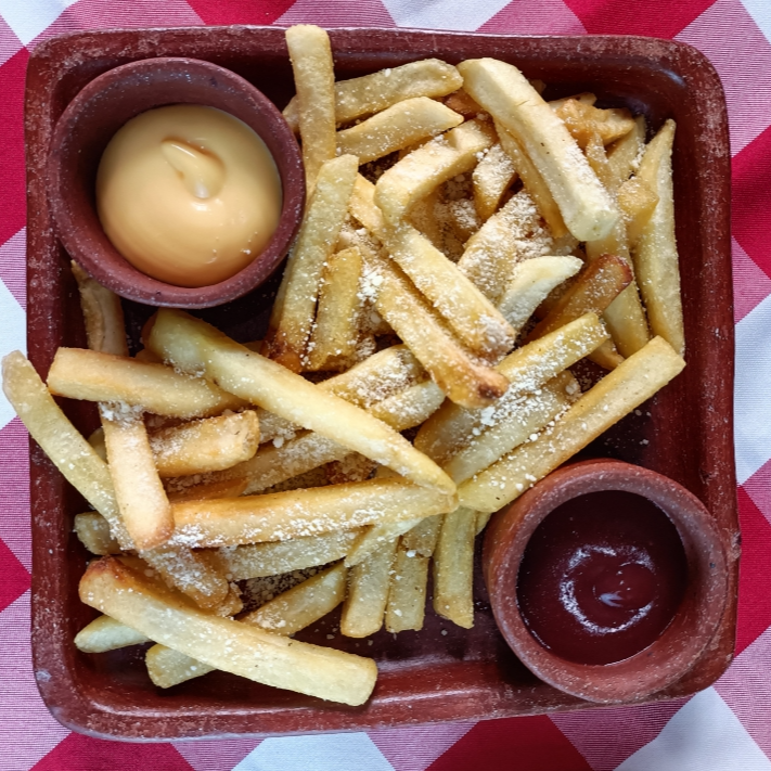 Tiras de papa sazonadas y fritas. Acompañadas de cátsup, queso amarillo y queso parmesano.