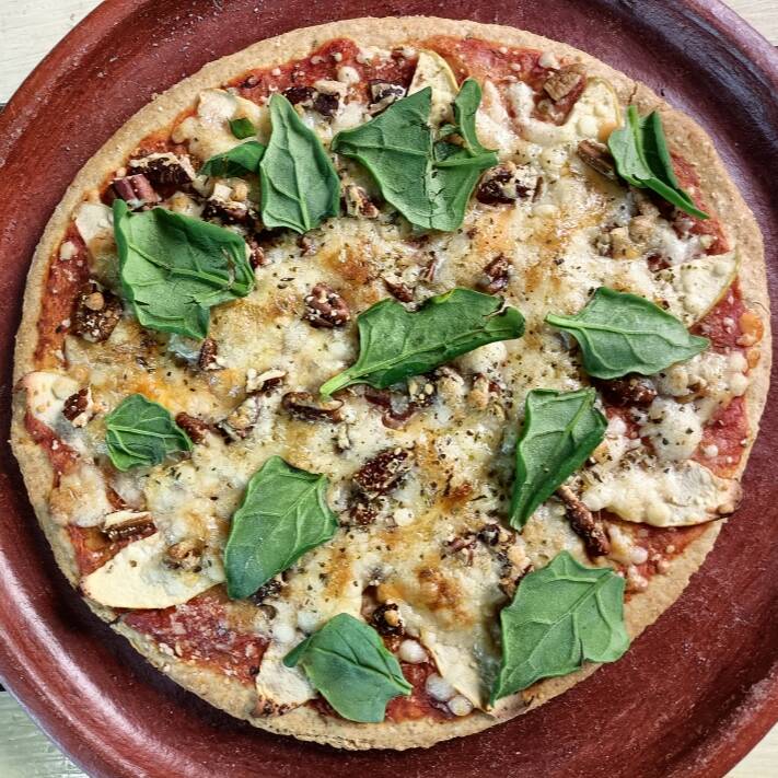 Base de avena con harina integral 23 cms aproximadamente, mezcla de quesos, salsa de tomate italiano, espinaca, manzana verde, nuez, queso de cabra y queso azul.