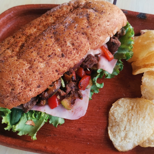 Pan italiano clásico con queso, verduras cocidas, lechuga, espinacas, mezcla de quesos, jamón y arrachera marinada.