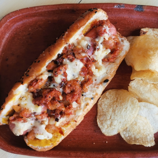 Pan artesanal, salchicha jumbo, mayonesa, mostaza, camarones al ajo, adherezo chipotle y mezcla de quesos.