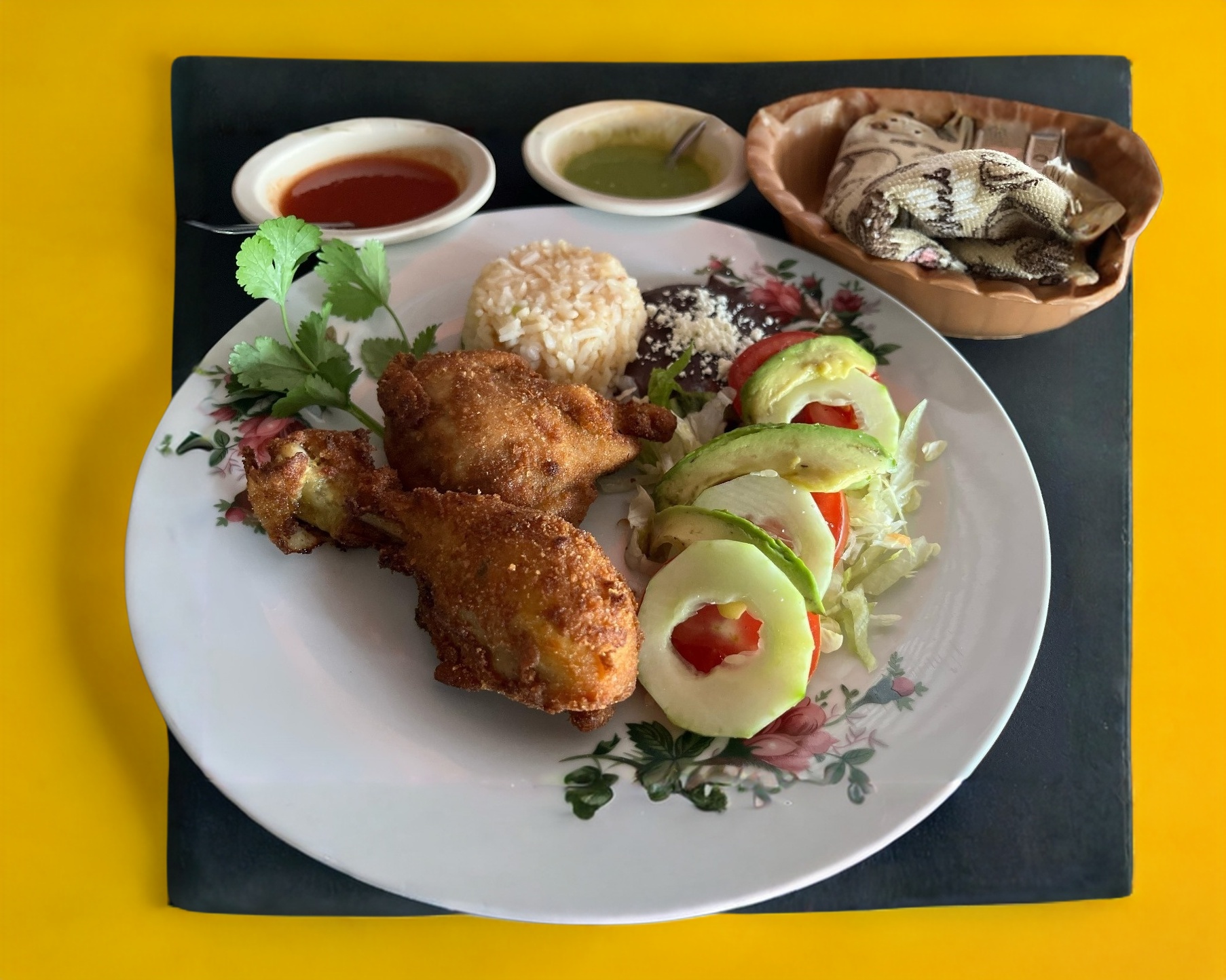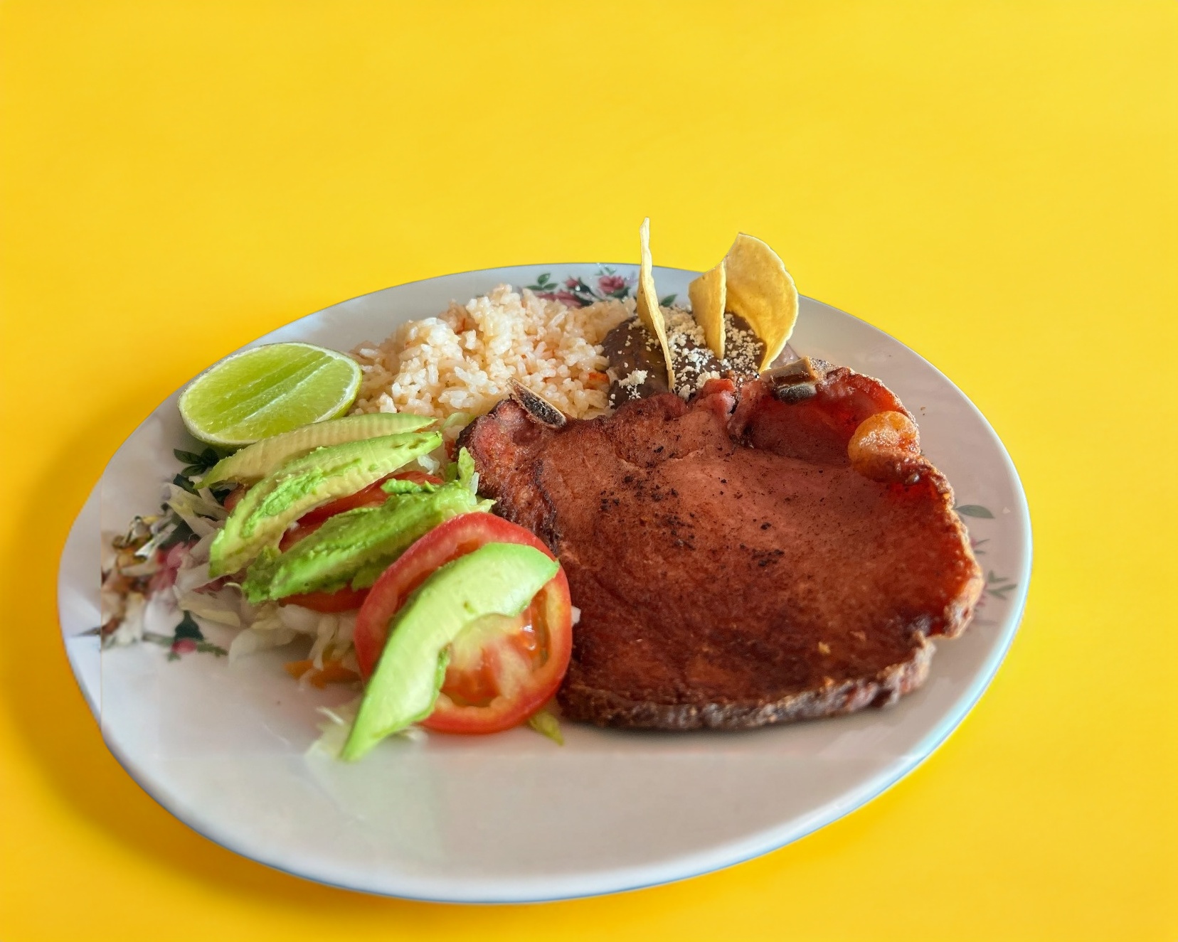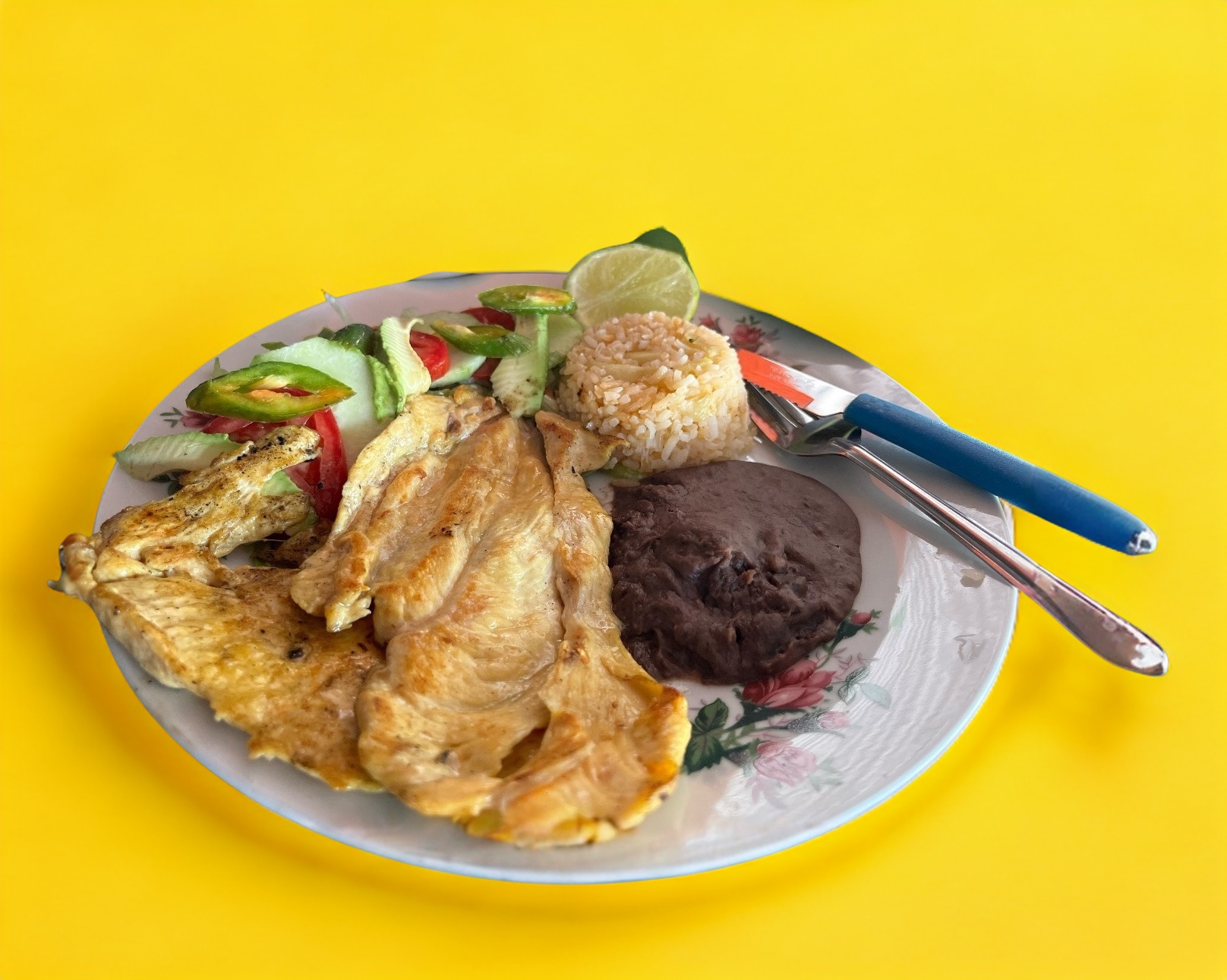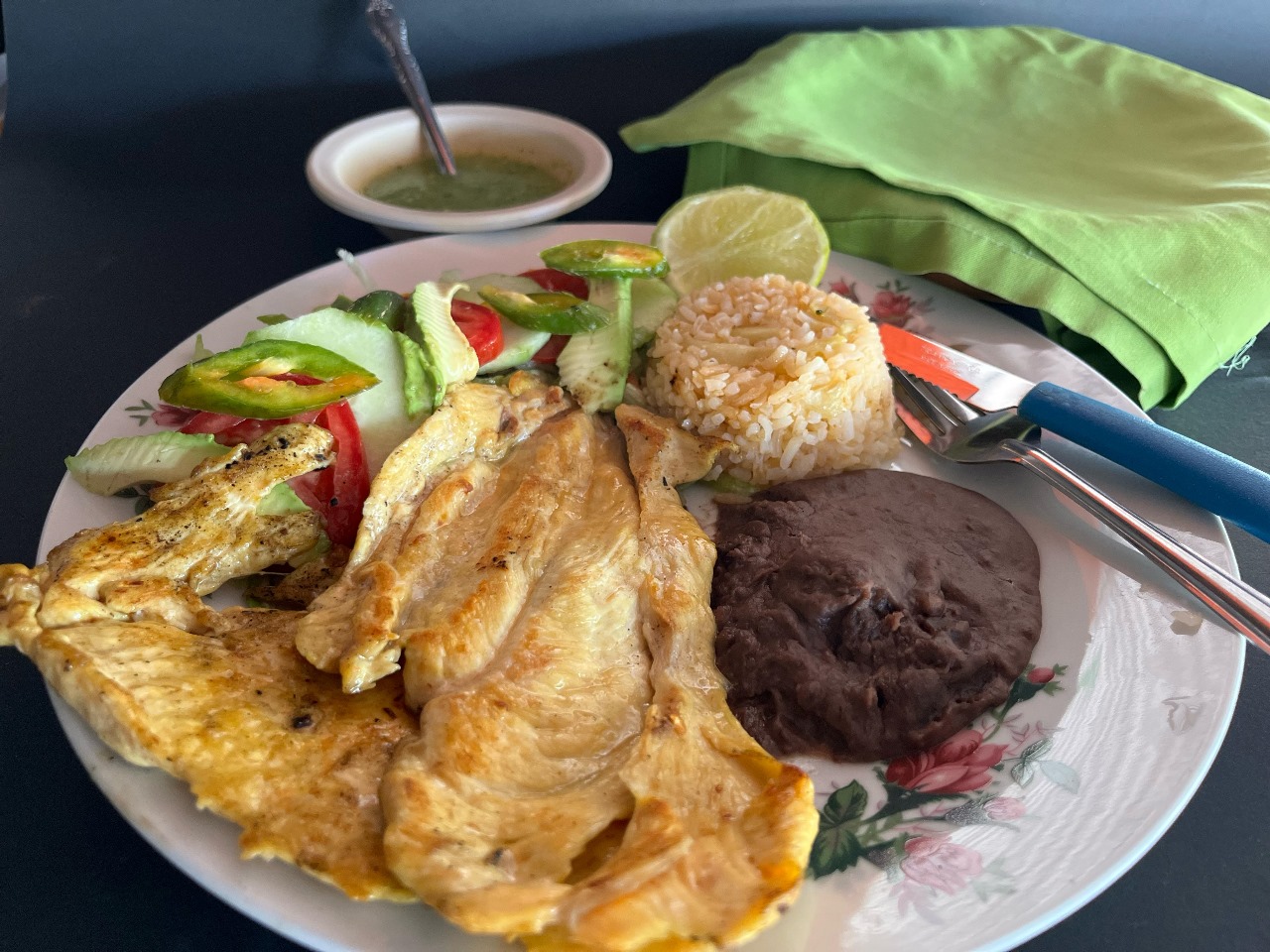 (Platillo personal )Incluye pechuga, 8 tortillas, salsa picante, ensalada de la casa, frijoles y arroz.