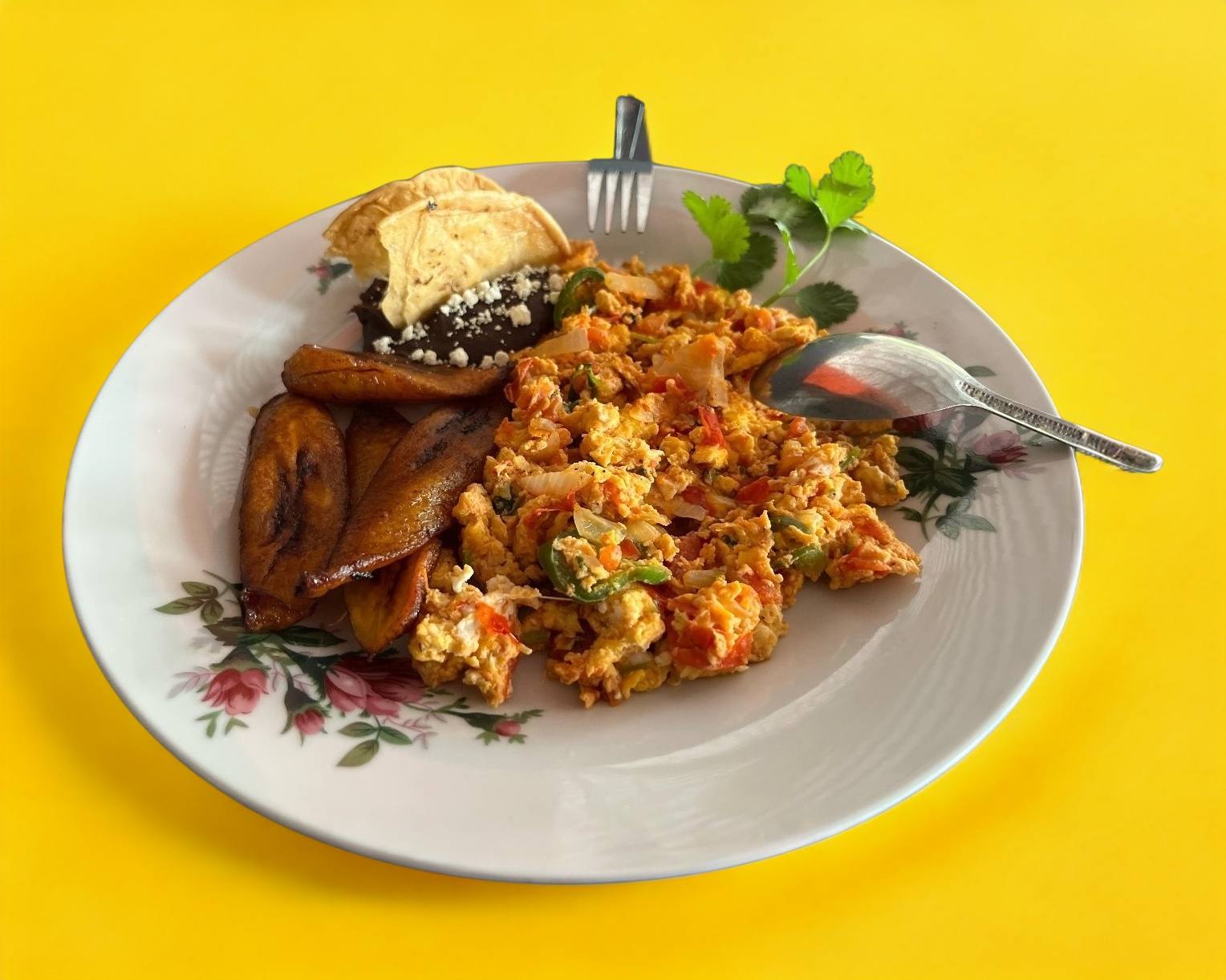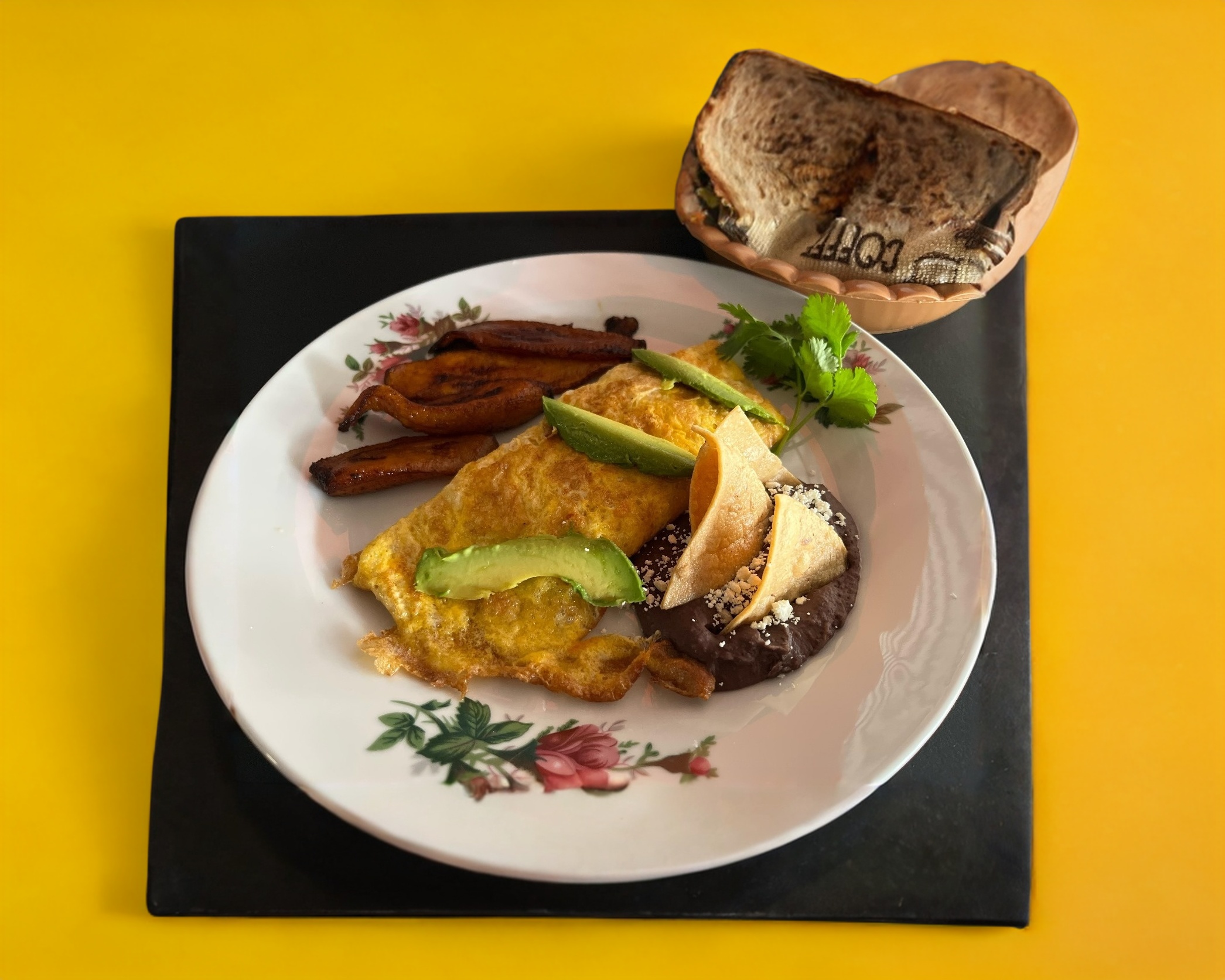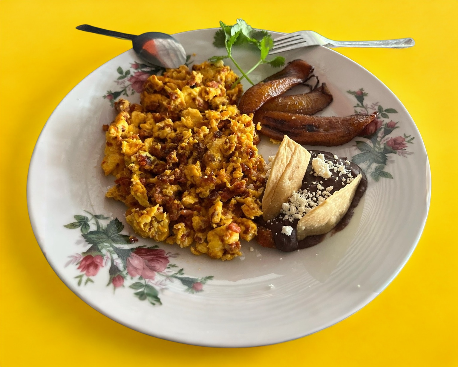Incluye guarnición de plátanos fritos con frijoles, con queso y crema.