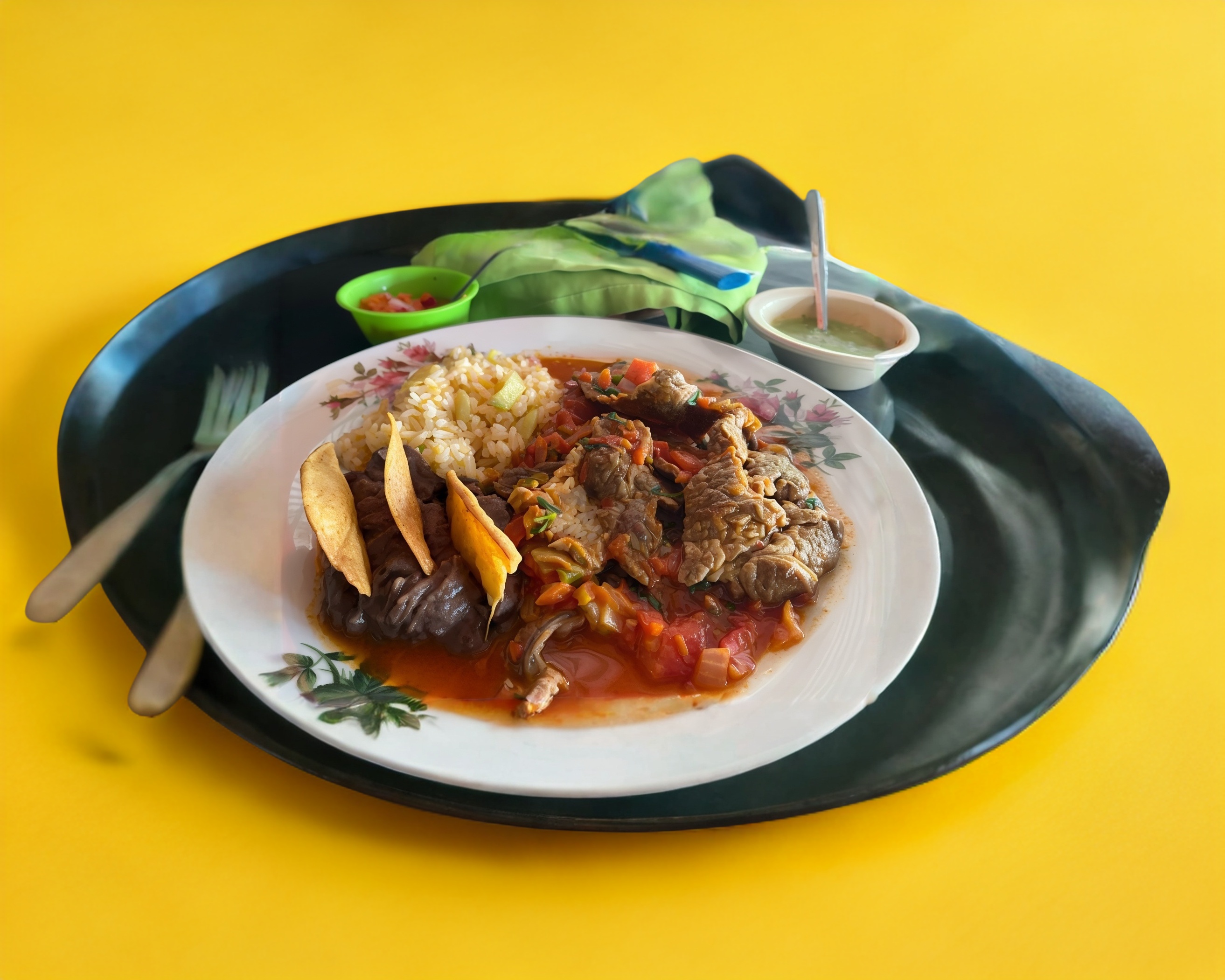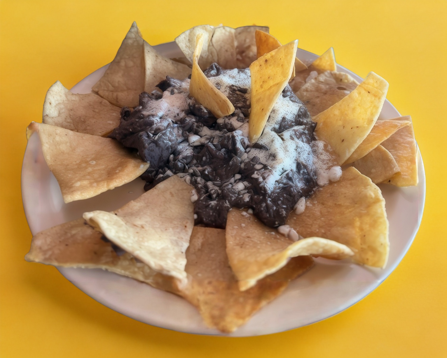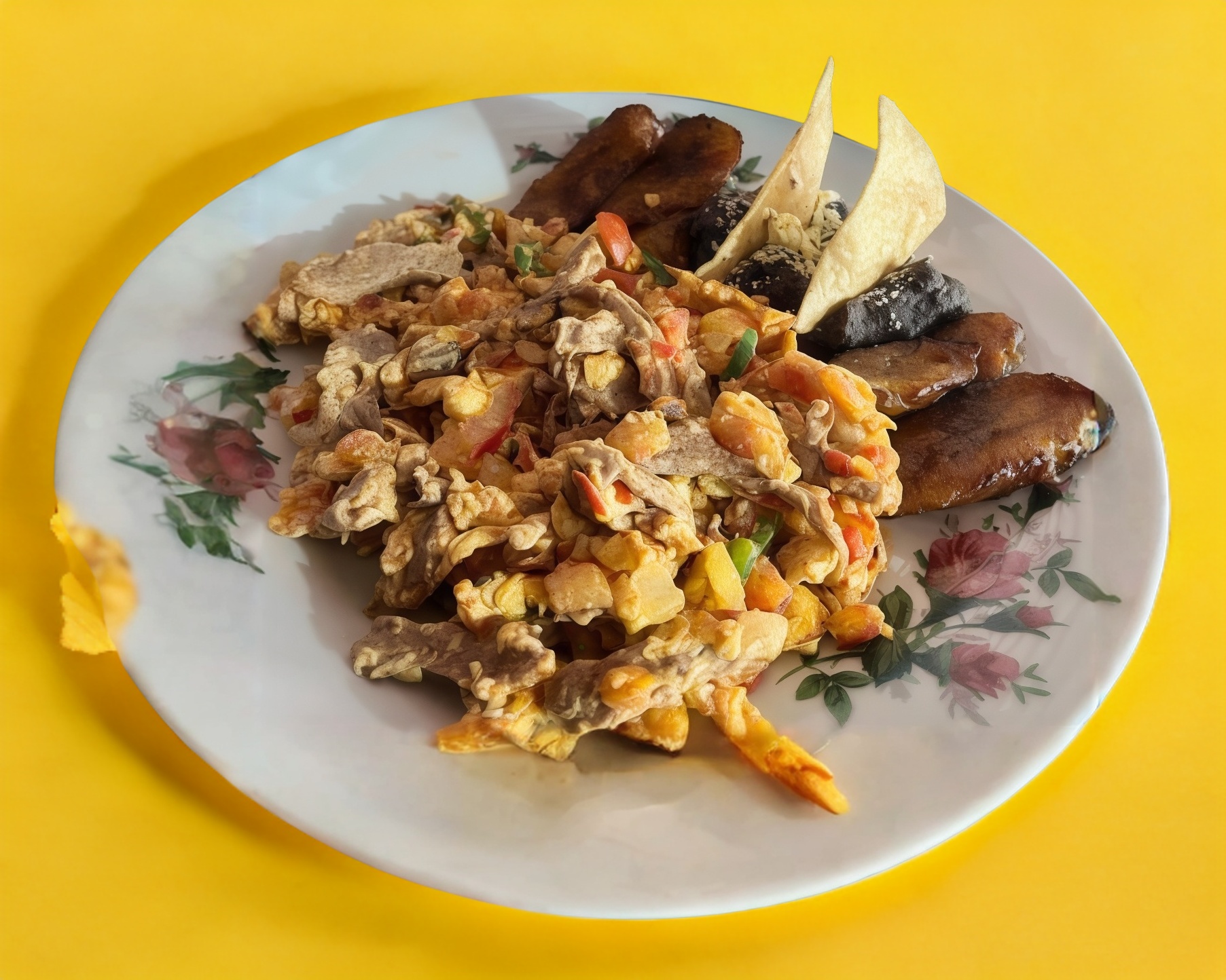 Incluye guarnición de plátanos fritos con frijoles, con queso y crema.