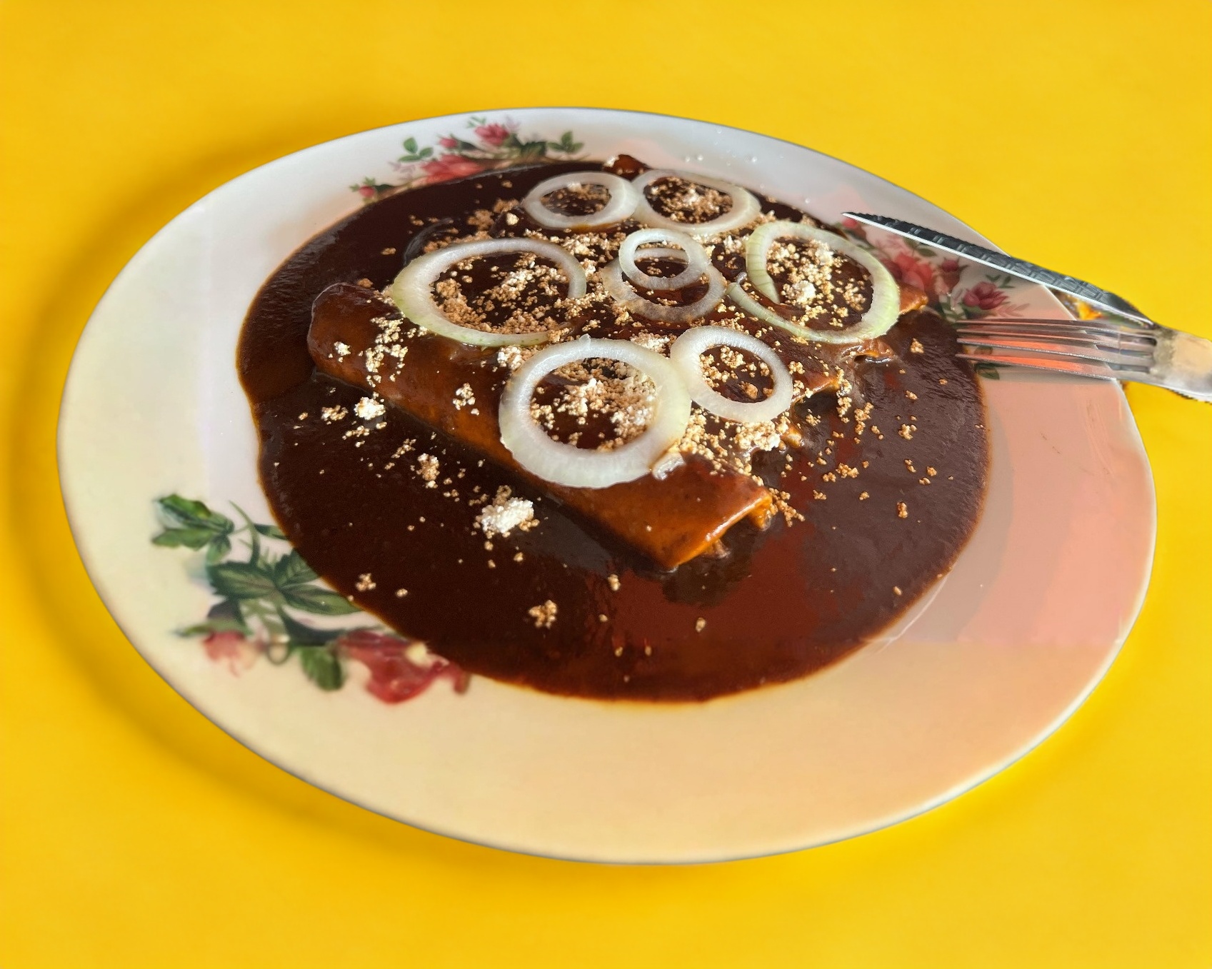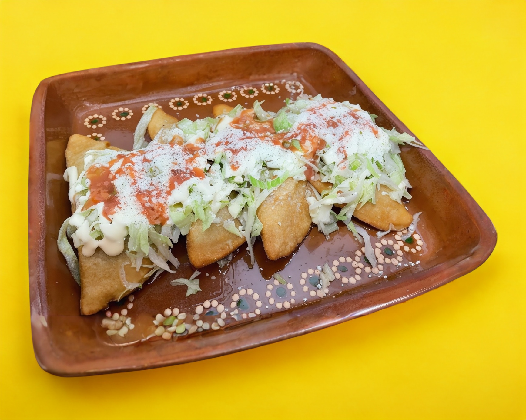 Bañadas de mole, rellenas de pollo, queso y crema.