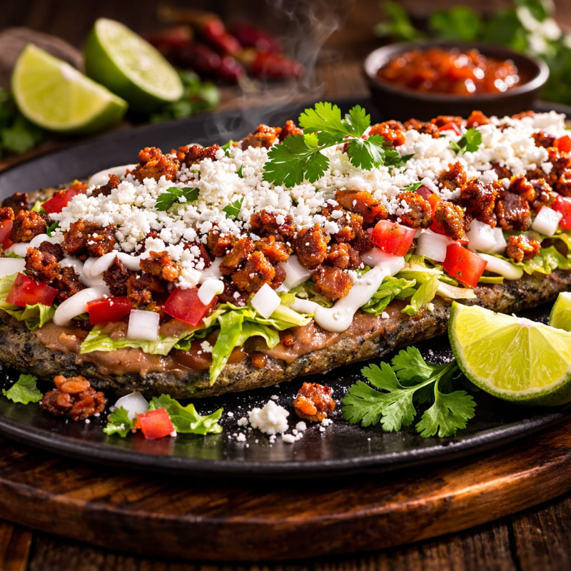 DELICIOSA BASE FRIJOL CON LECHUGA, TOMATE Y CARNE DE CHORIZO O PASTOR CON CREMA Y QUESO