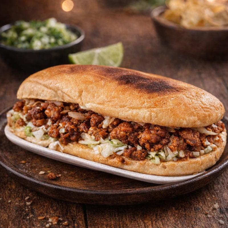 PAN TELERA CON BASE DE FRIJOL, LECHUGA TOMATE CHILE RAJAS AGUACATE Y CARNE A ELEGIR, PASTOR O CHORIZO ESPAÑOL