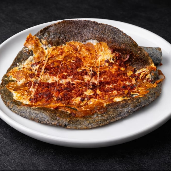 DELICIOSA TORTILLA DE MAIZ AZUL QUESILLO DERRETIDO ACOMPAÑADO DE LA CARNE DE SU ELECCION ADOBADA DE PASTOR O CHORIZO ESPAÑOL