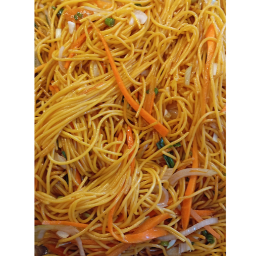 Pasta de Sémola salteada con salsa de soya, cebollín y zanahorias.
