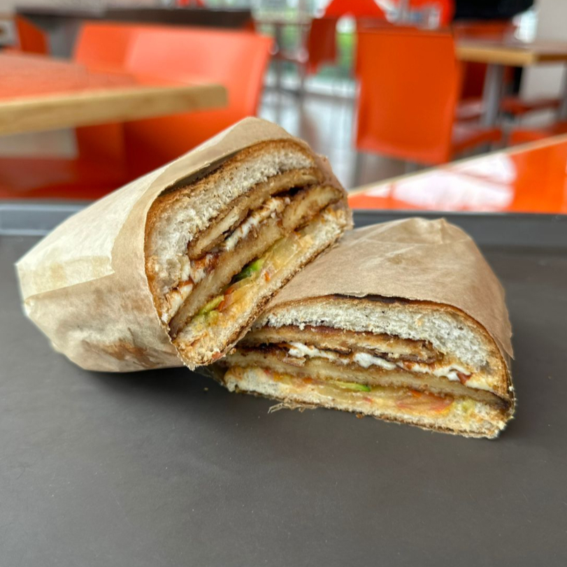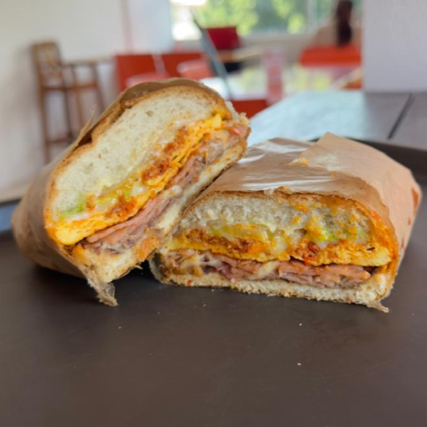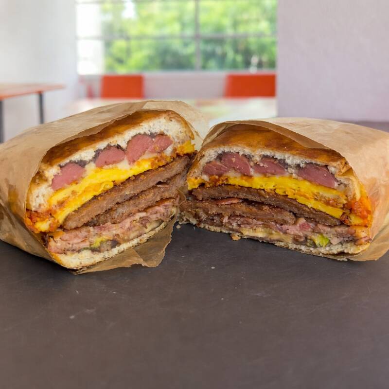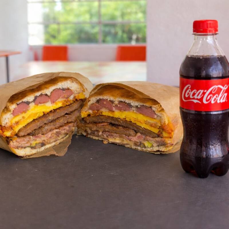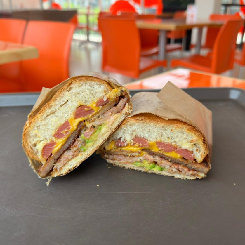 Si buscas desayuno y almuerzo en una sola comida esta es tu opcion. Torta con base de rica costra de queso oaxaca y jamon, milanesa de res empanizada, tortilla de huevo con chorizo en la cual se gratina queso blanco, y salchicha para coronar.