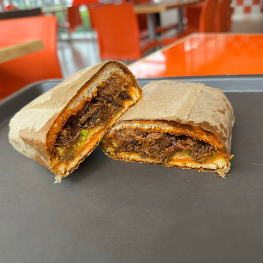 Torta hecha a base de deliciosa Birria de res montada sobre una costra de queso oaxaca, acompañada de cebolla morada.