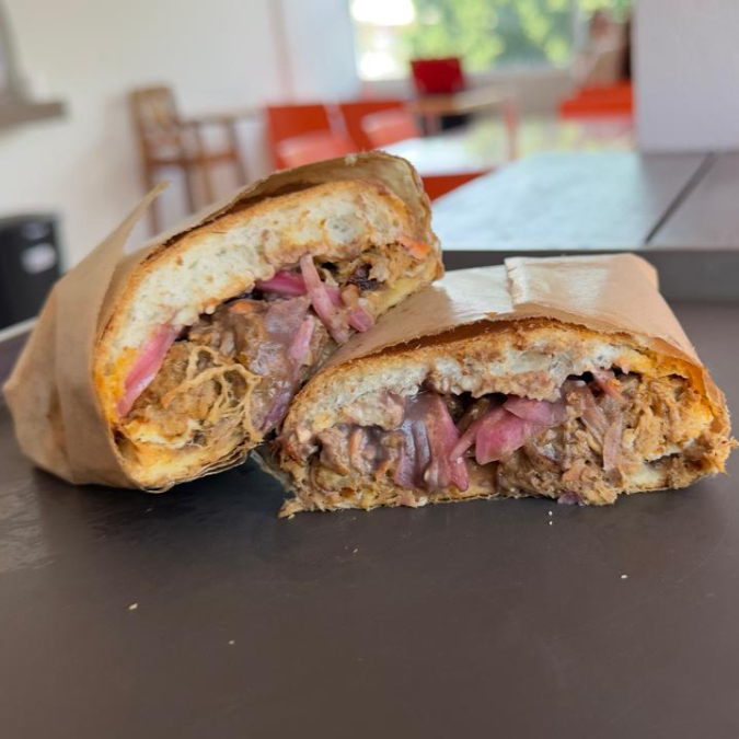 Esto es muy Tuxtleco. Torta de deliciosa Cochinita pibil montada sobre una costra de queso oaxaca y acompañada de cebolla morada.