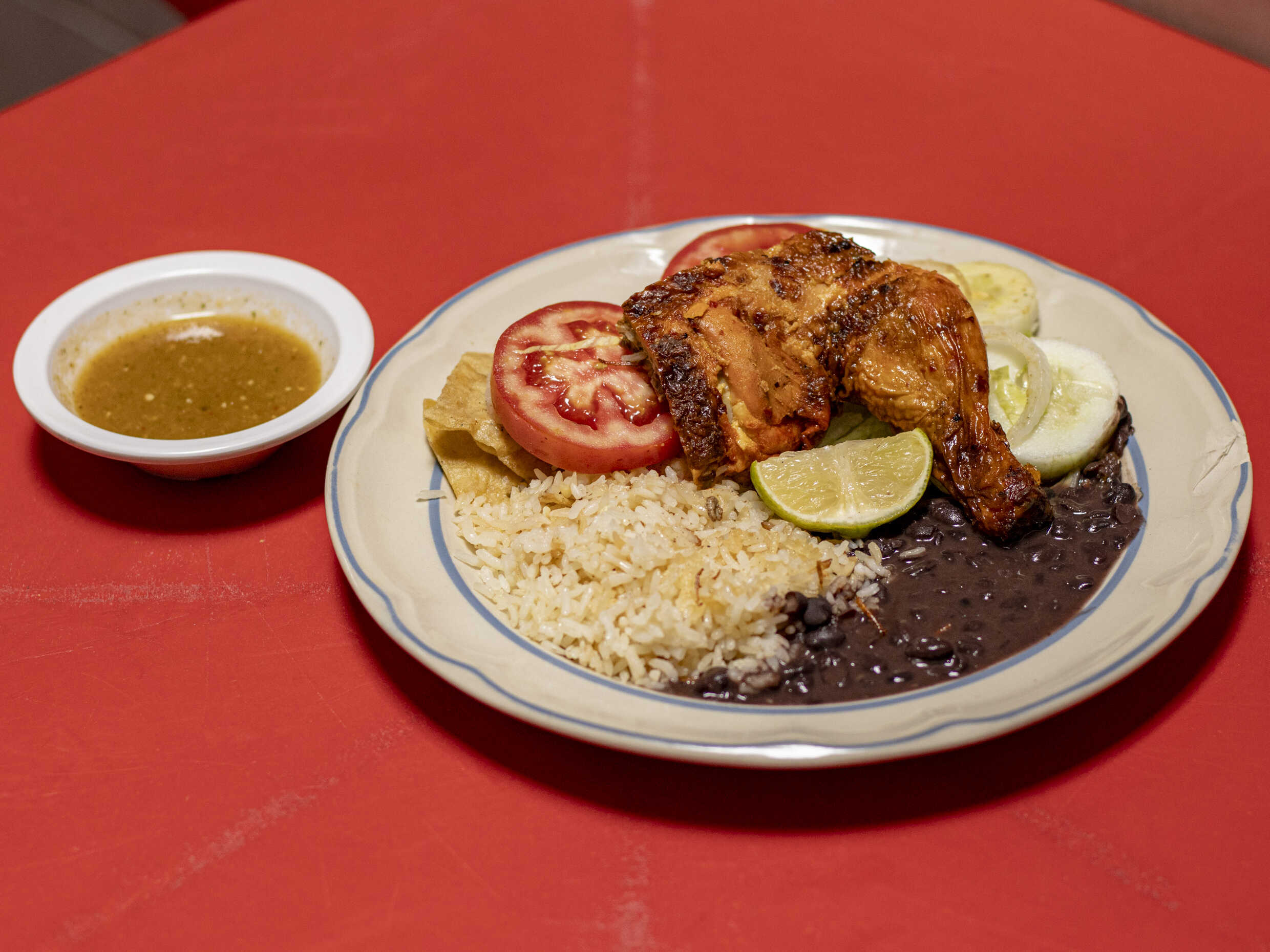 1 pieza de pollo, Guisado de arroz y frijoles , 1 tortilla.