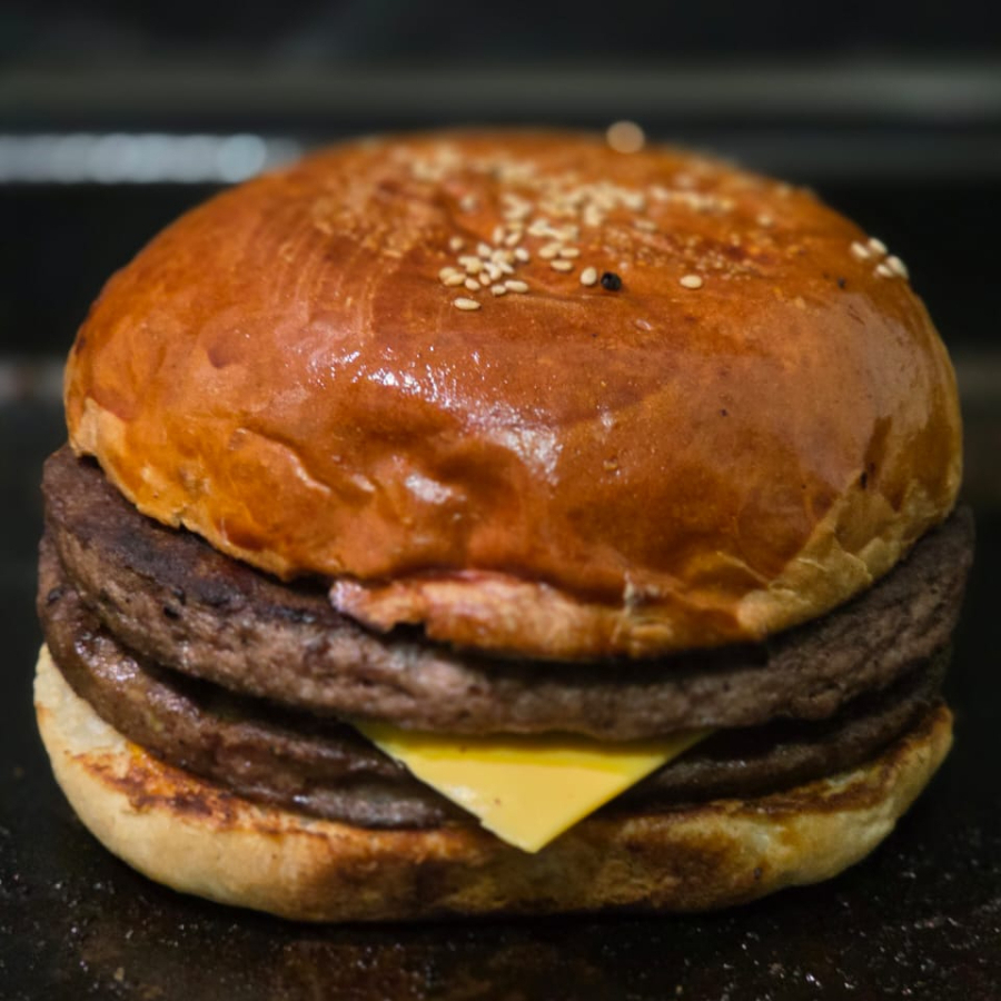 Doble Carne 100% de res, pan artesanal, queso amarillo, vegetales frescos (lechuga, tomate, cebolla, jalapeño).