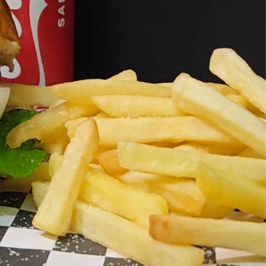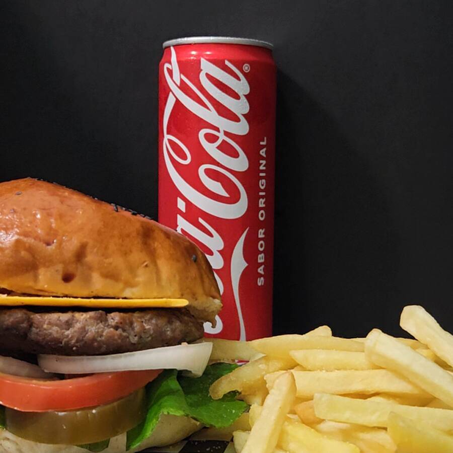 Hamburguesa con 100 gr de carne 1000% de res, acompañada de refresco de cola (355ml.) y papas a la francesa (150gr.)