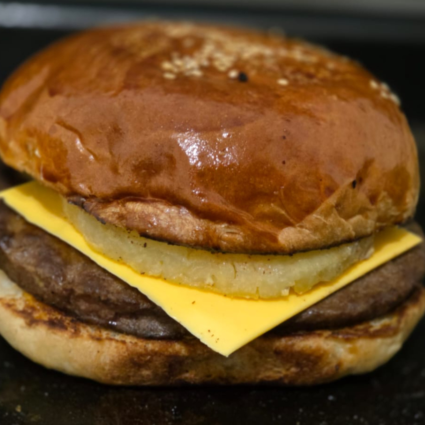 Doble Carne 100% de res, piña, tocino, cebolla caramelizada, pan artesanal, queso amarillo, vegetales frescos (lechuga, tomate, cebolla, jalapeño).