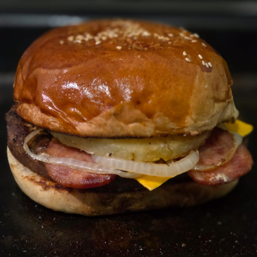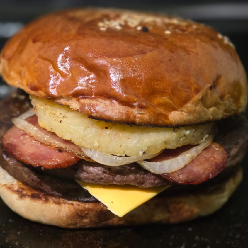 Carne 100% de res, piña, tocino, cebolla caramelizada pan artesanal, queso amarillo, vegetales frescos (lechuga, tomate, cebolla, jalapeño).