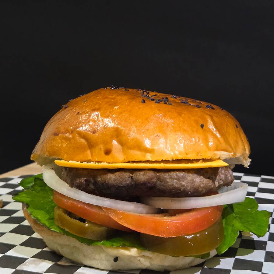 100gr de carne 100% res, queso amarillo, tomate, cebolla, lechuga, jalapeño y aderezo especial