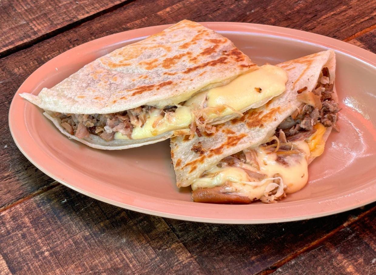 Deliciosa Quesadilla de tortilla de harina de 21 cm de diámetro aprox. Bien rellena de carnita horneda y queso manchego de pijijiapan fundido