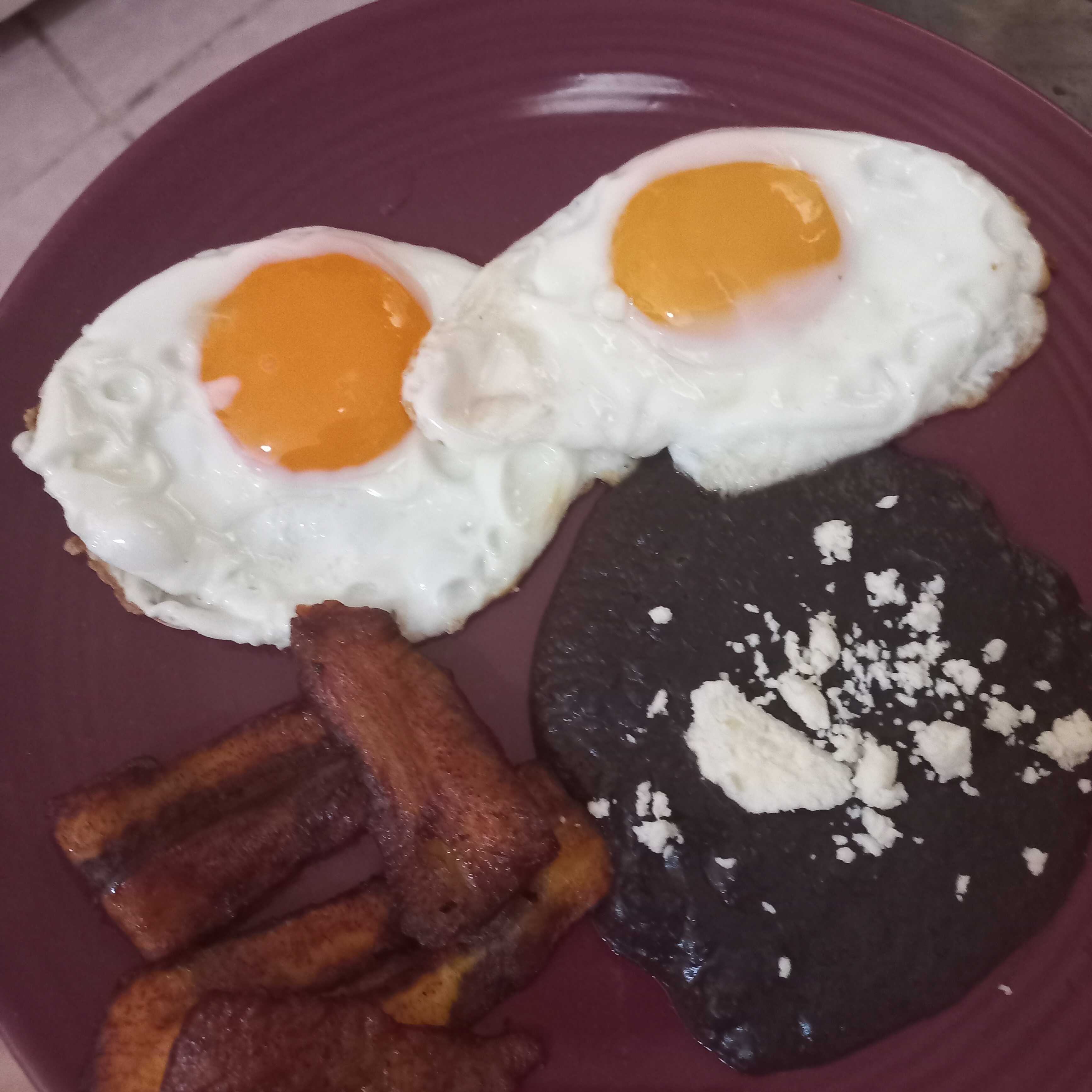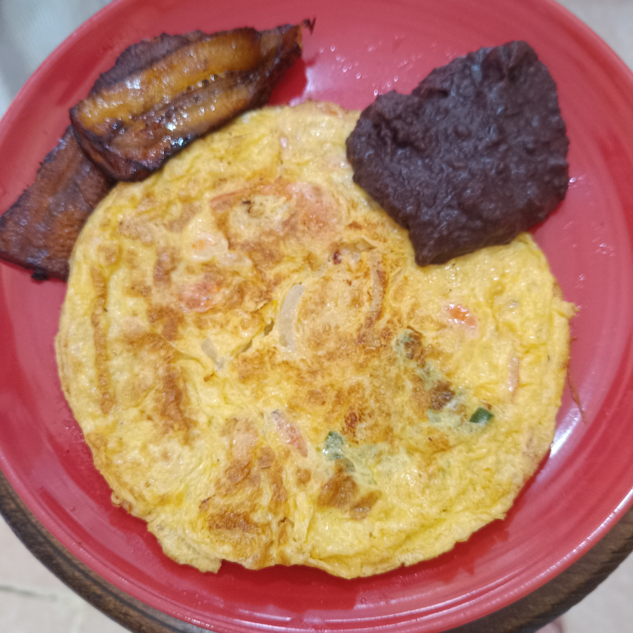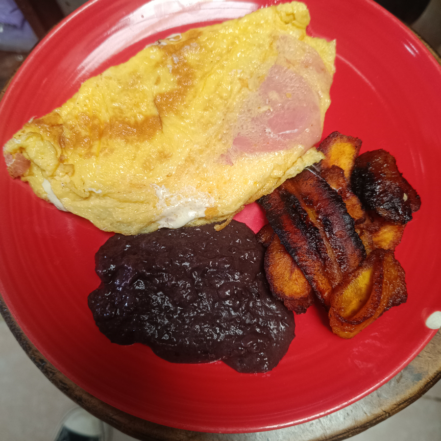 Dos huevos en torta rellena de jamón y quesillo, acompañado de frijol y plátanos fritos , tortillas y salsa