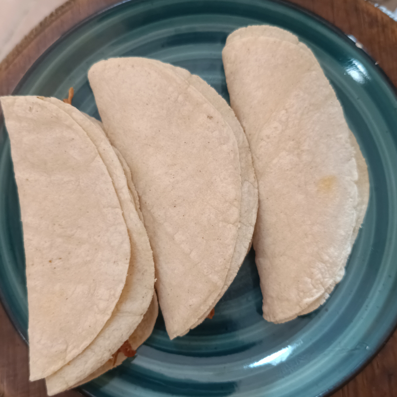 Tortillas tamaño normal rellena de carne cerdo, acompaño de salsa y verduras.