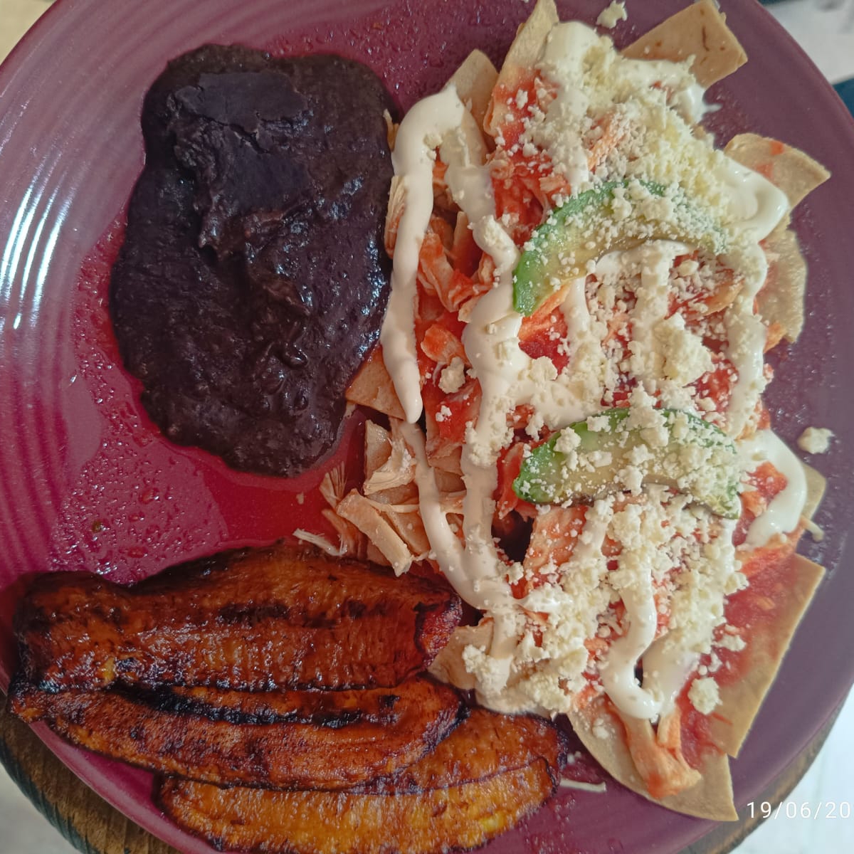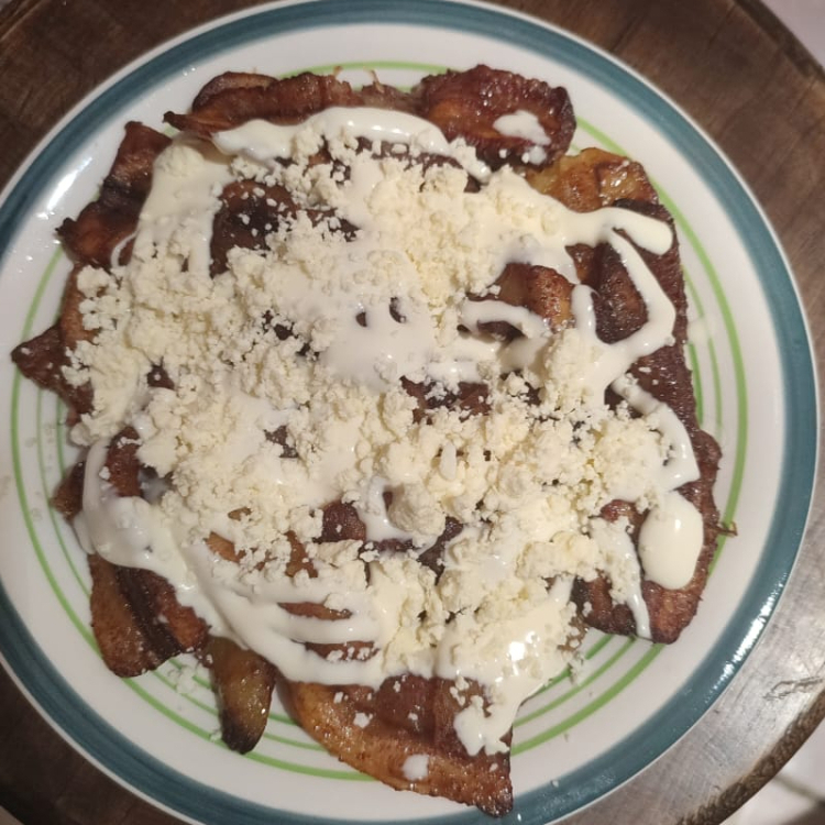 TOTOPOS BAÑADOS EN SALSA ROJA Y UNA PROTEINA DE SU ELECCION CON POLLO O CON HUEVOS (2 PZAS.) CON CREMA. QUESO Y AGUACATE.