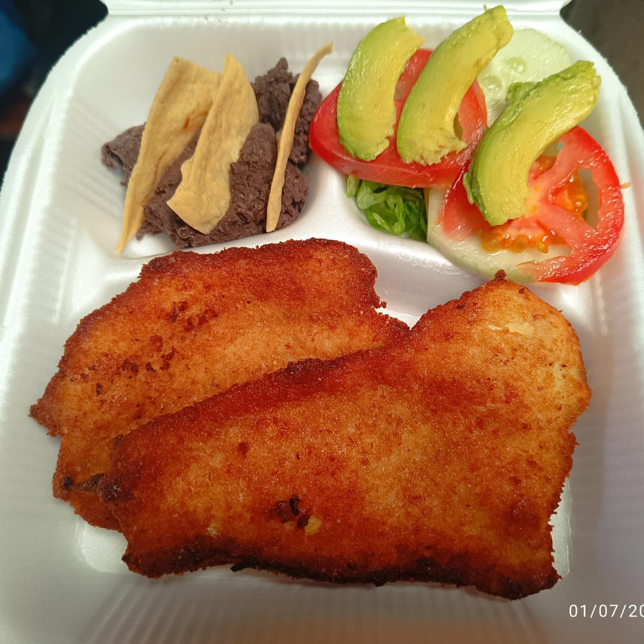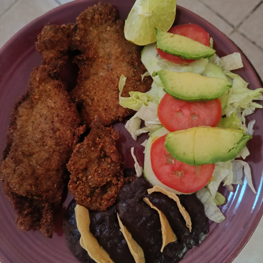 Carne de res empanizado, acompañado de frijol y ensalada o arroz