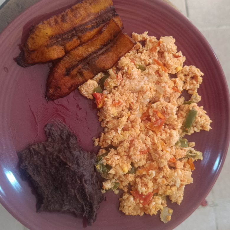 Dos huevos vueltos con tomate cebolla y chile jalapeño, acompañado de frijol plátanos fritos, tortilla y salsa