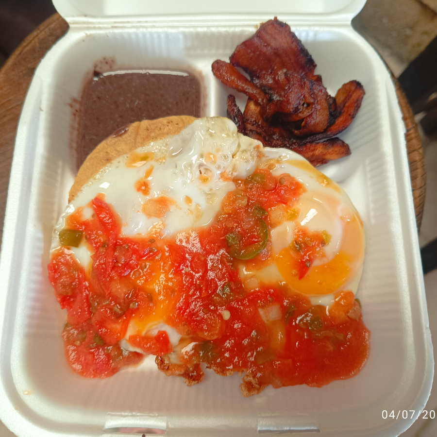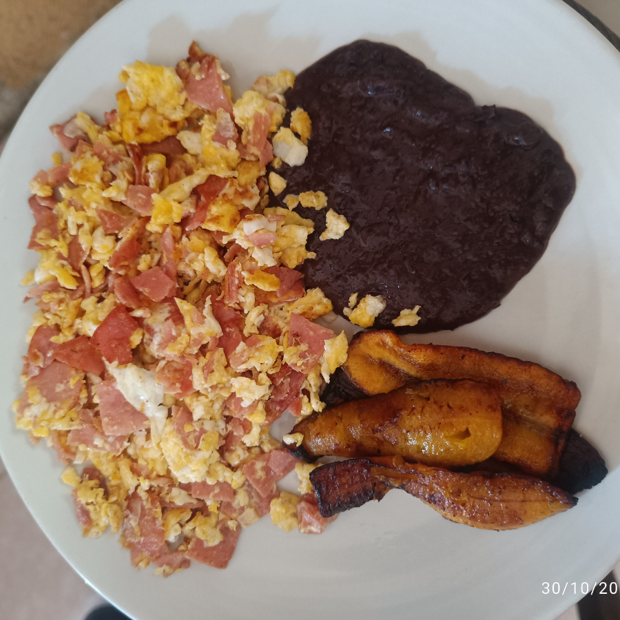 Huevos revueltos con tocino, va acompañado de tortilla, platanos y frijoles fritos.