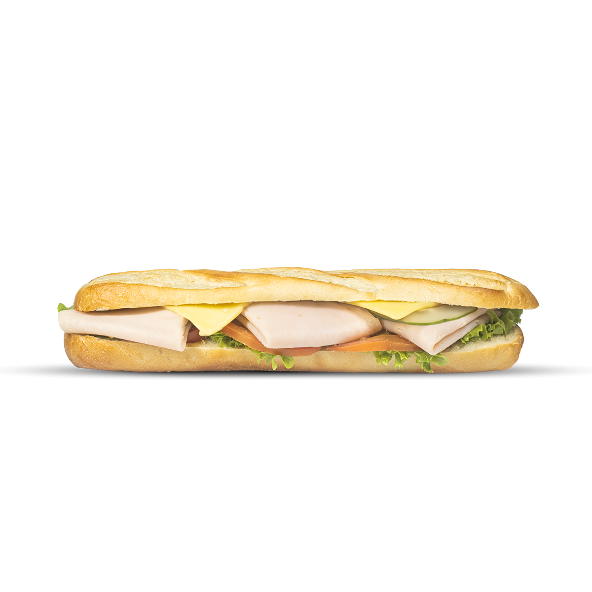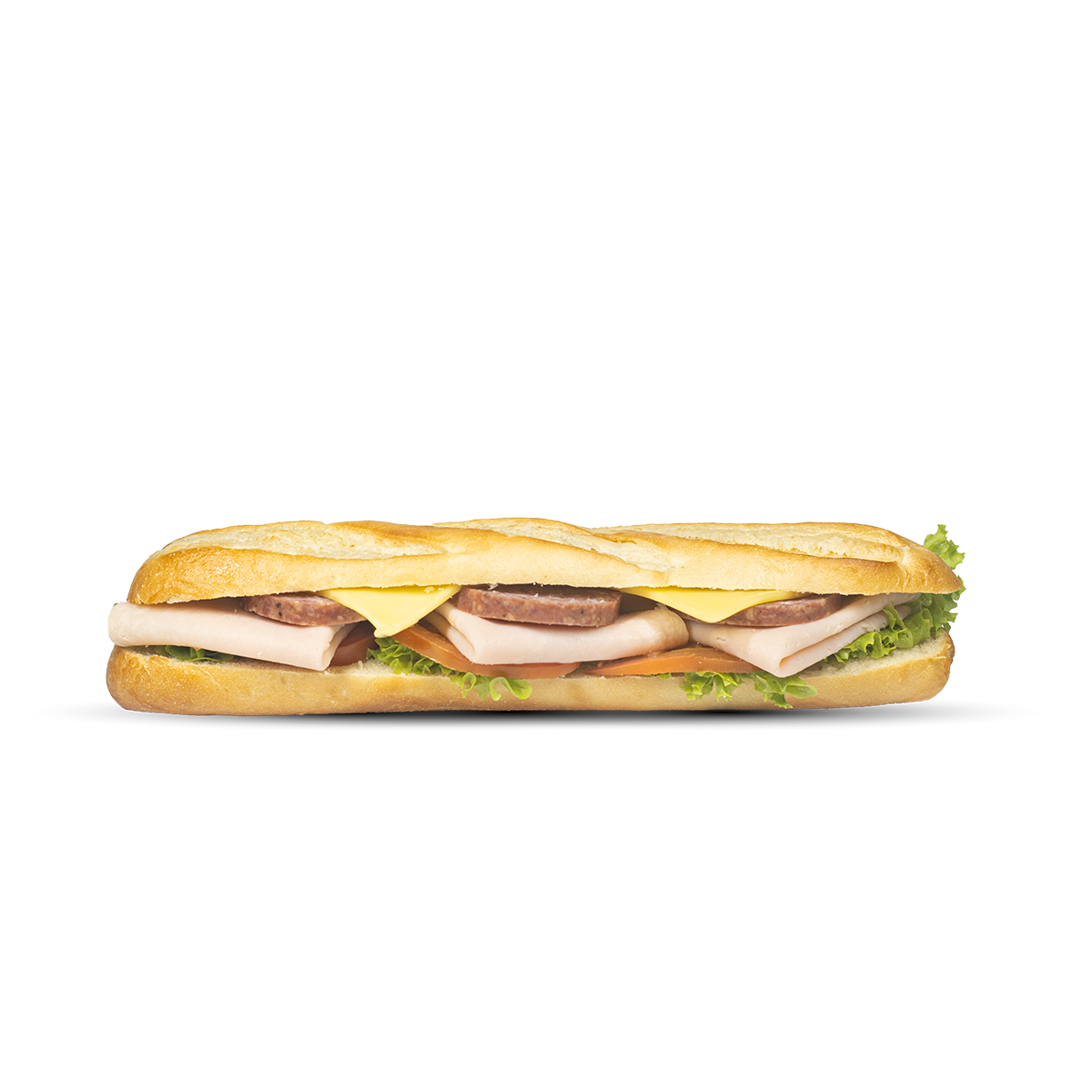 Aderezo chipotle, lechuga, tomate, jamón de pavo, salami y manchego.