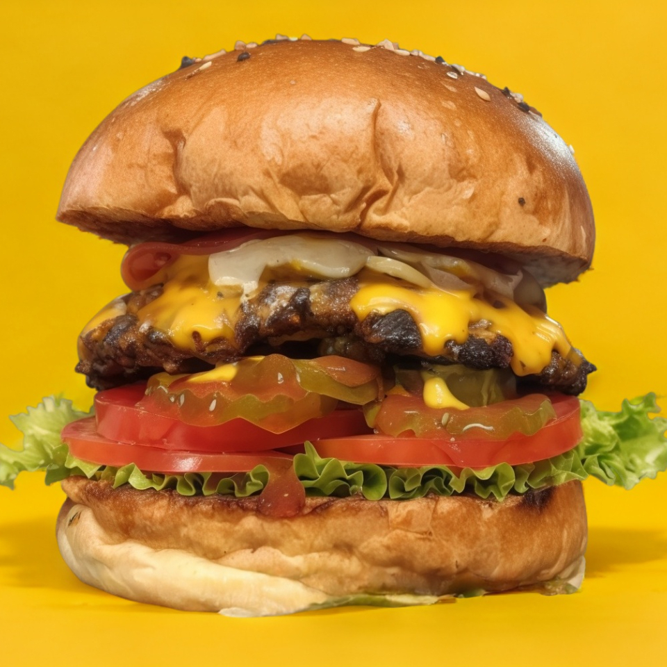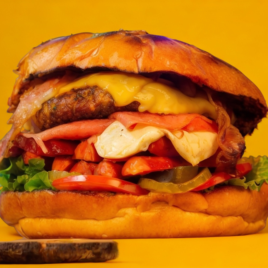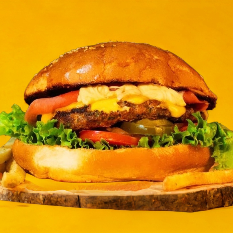 Carne de res 420 gr. con Queso amarillo, pan, mayonesa, catsup, mostaza, chiles en vinagre, Cebolla, Pepinillos, tomáte, lechuga, queso o tocino.