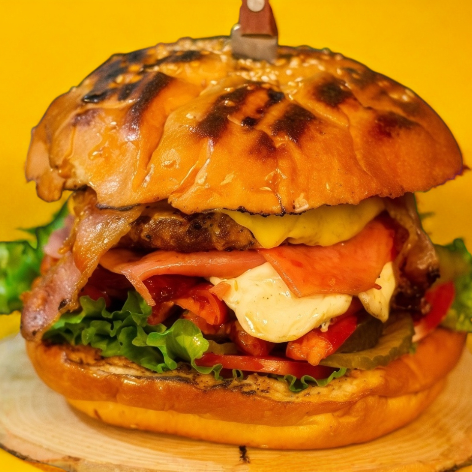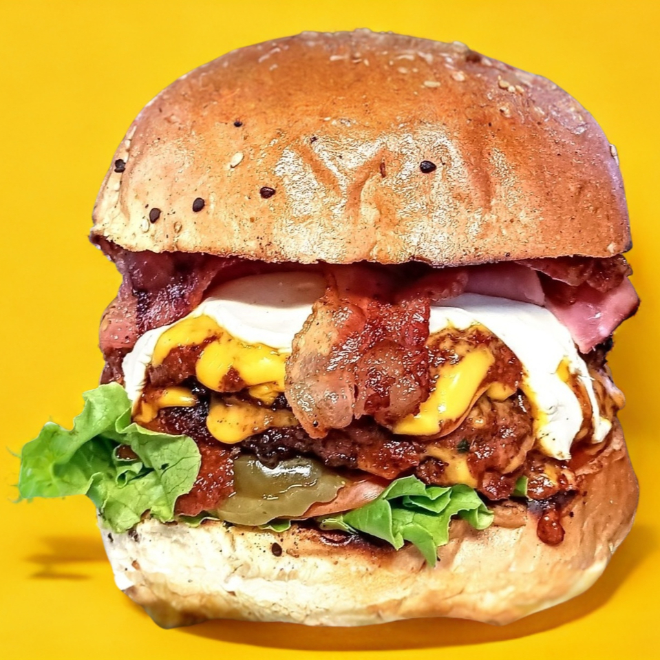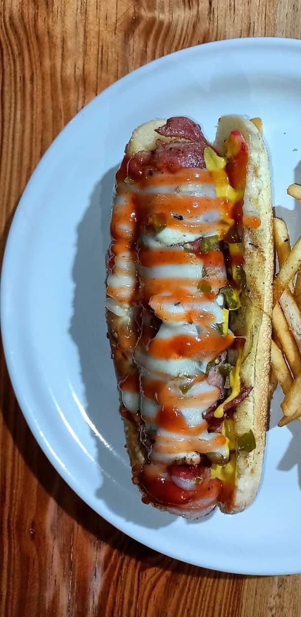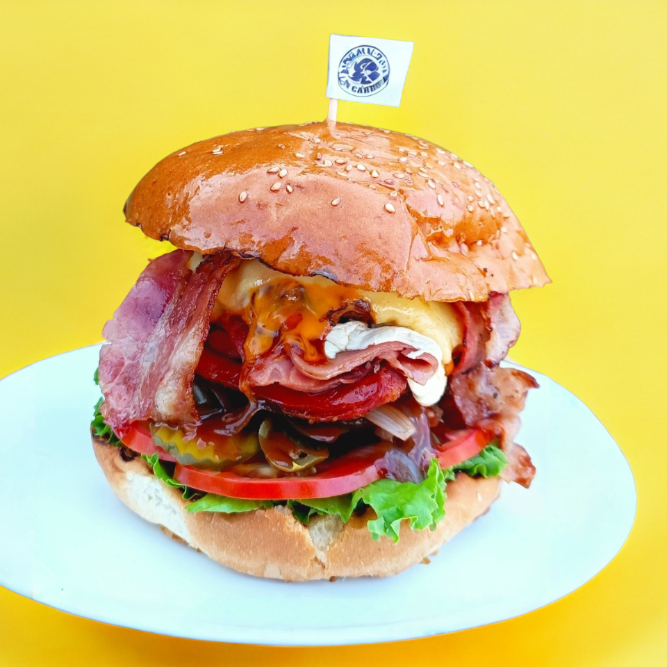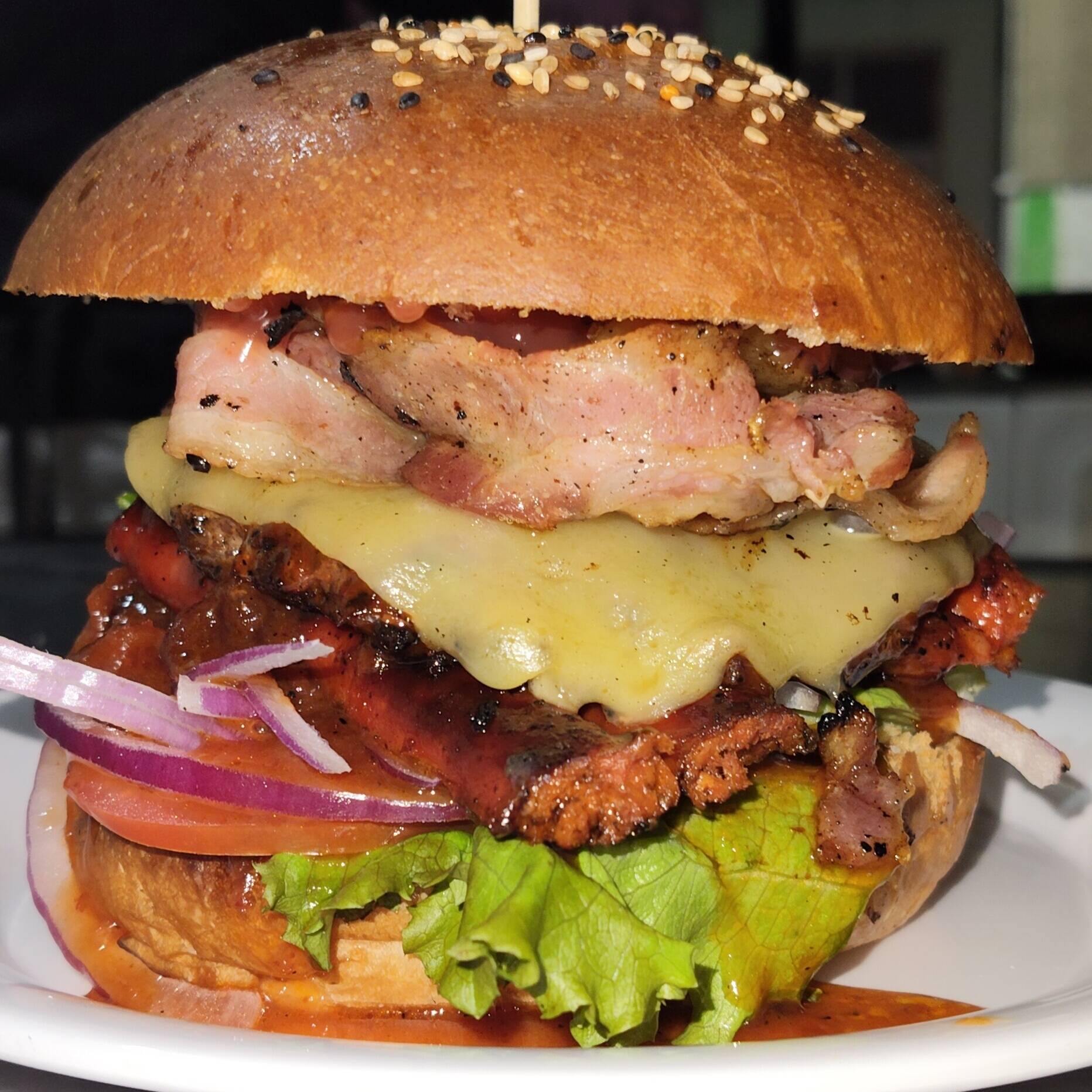 140 gr. De carne de res bañada en salsa BBQ, Pan, mayonesa, catsup, mostaza, chiles en vinagre, cebolla caramelizada, pepinillos, tomate, lechuga, queso amarillo, quesillo, jamón de pavo y tocino.
