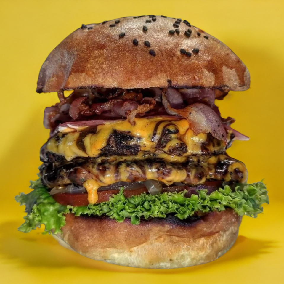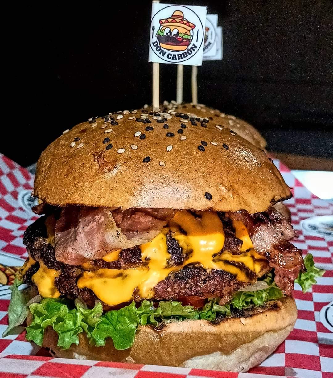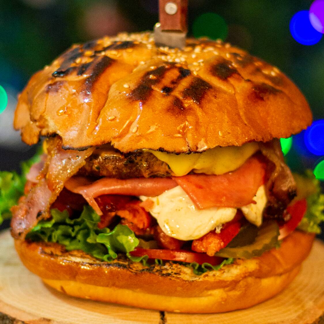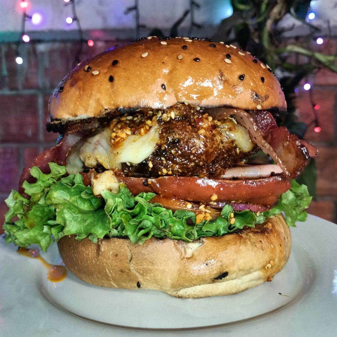 250 gr. De carne de res rellena de queso manchego, bañada en salsa a elegir, quesillo, queso amarillo, jamón de pavo, 100 gr. De tocino, lechuga, tomate, cebolla caramelizada, chiles en vinagre, pepinillos, mayonesa y cátsup.