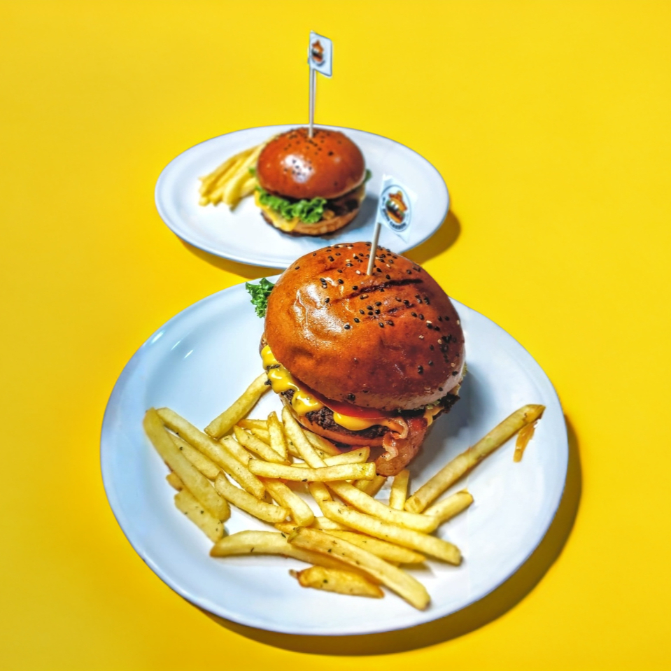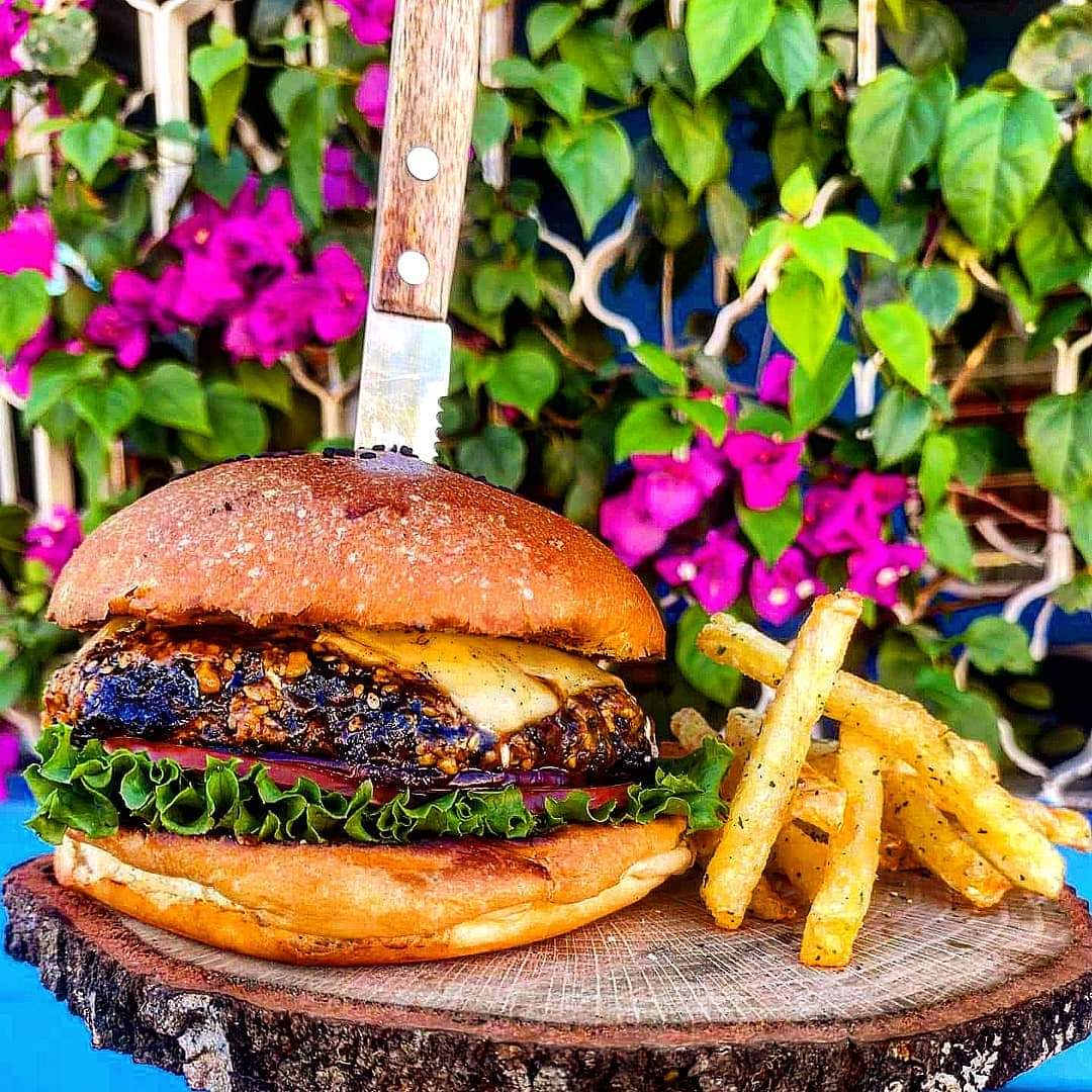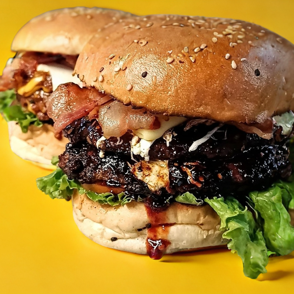 140 gr. De carne de res bañada en salsa de flor de Jamaica con chile de árbol, manchego y quesillo fundido, tocino, tomate, cebolla morada y lechuga.