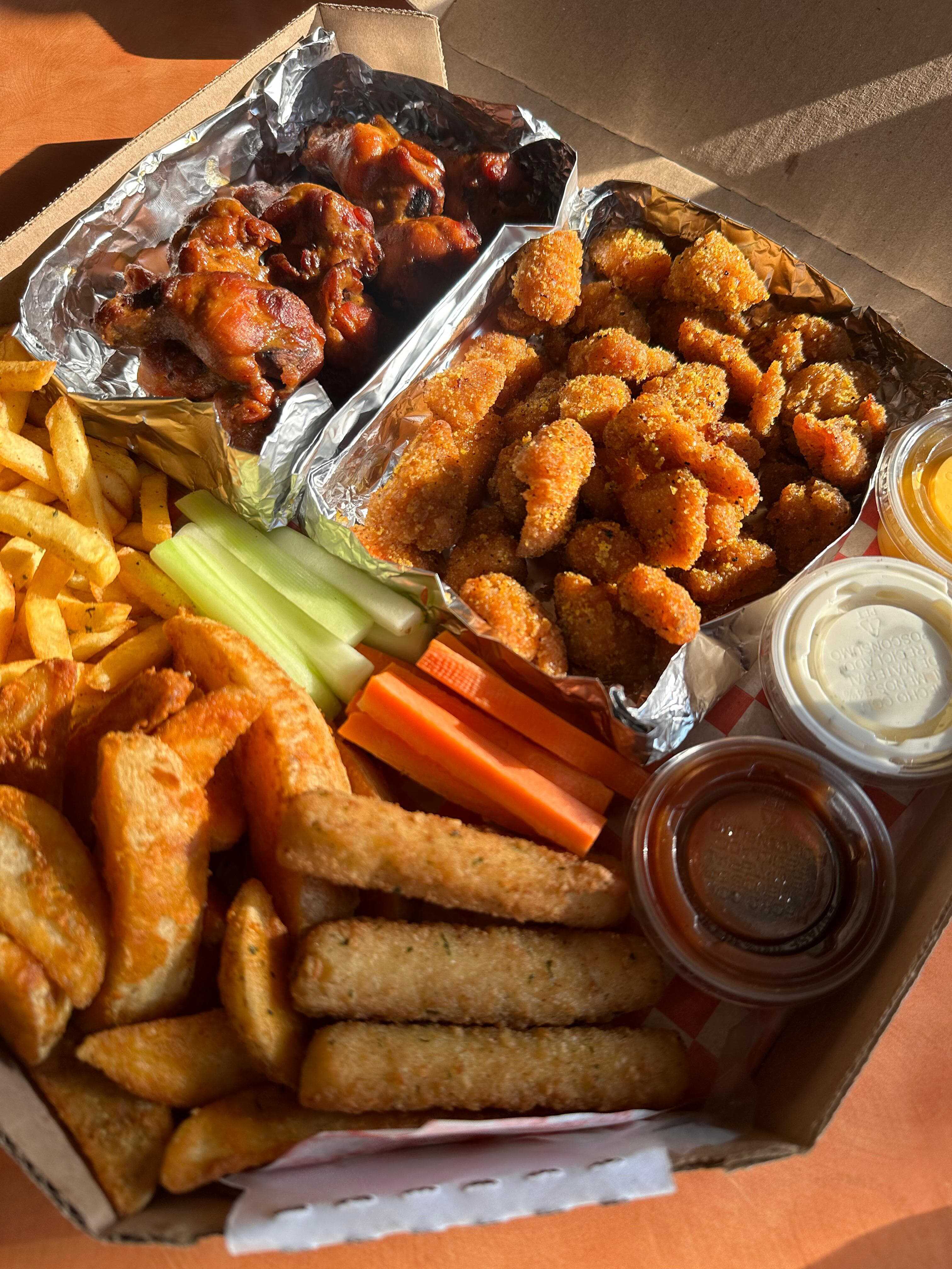 300 g de boleless, 300 g de alitas, papas a la francesa, papas gajo, aros de cebolla, 3 aderezos a elegir