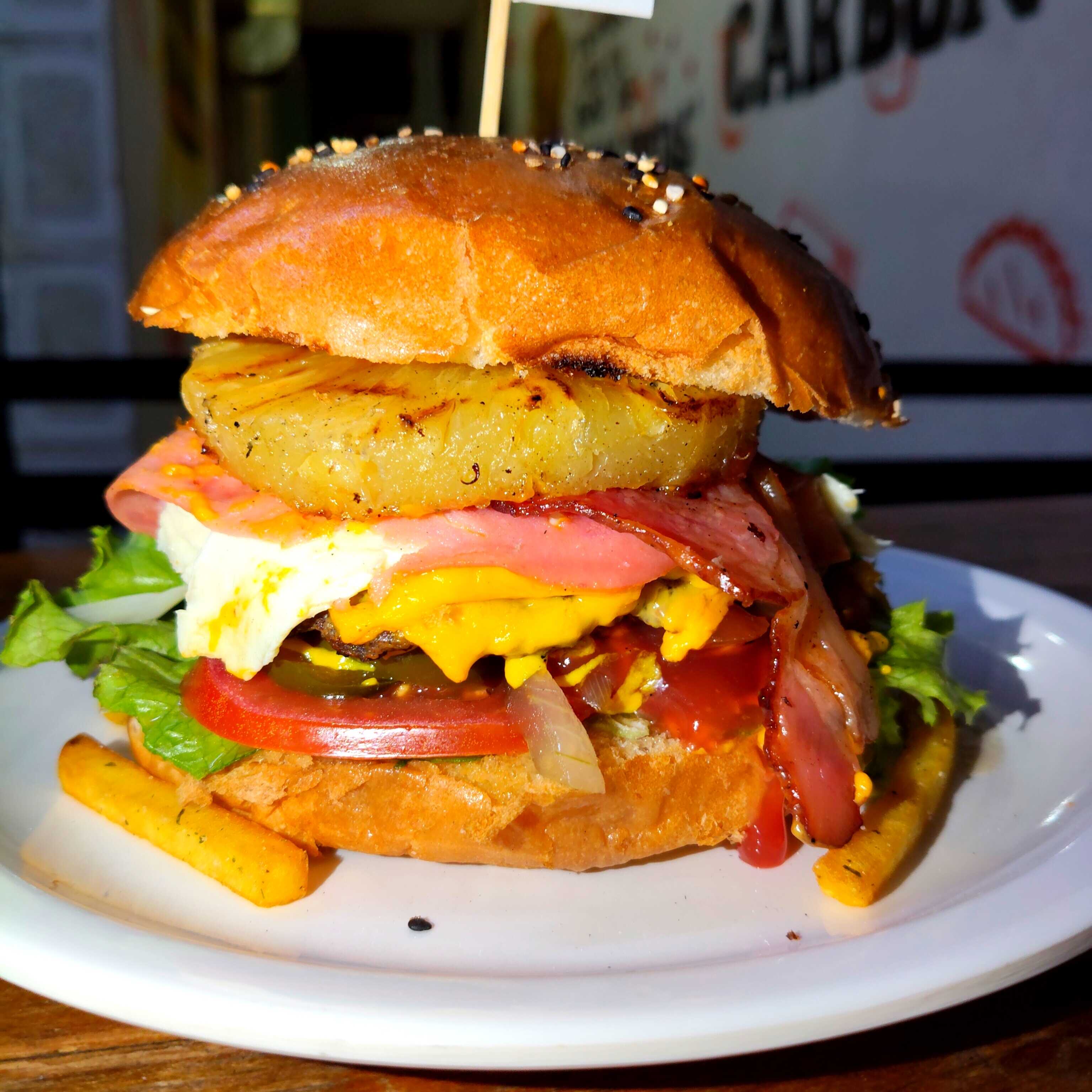 Pan Artesanal, Carne de res 65g., Piña en almíbar asada, Queso cheddar, quesillo, jamón, tomate, chiles en escabeche, pepinillos,cebolla caramelizada, lechuga, mayonesa, catsup y mostaza.
