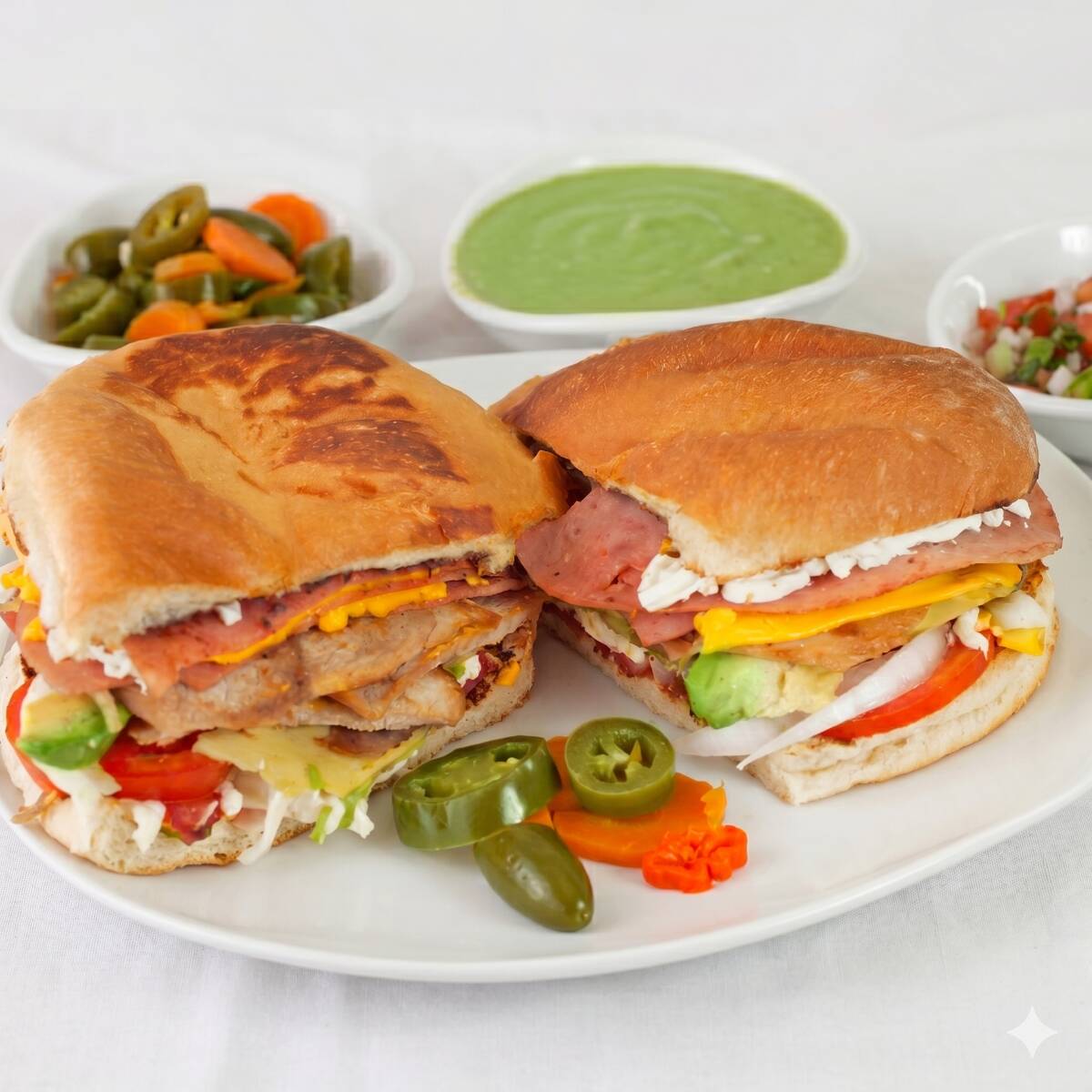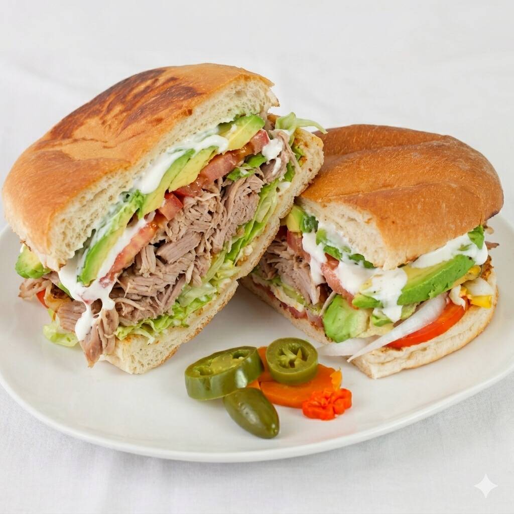 Jamón doble, quesillo, queso amarillo, jitomate, aguacate, cebolla, frijoles, mayonesa.