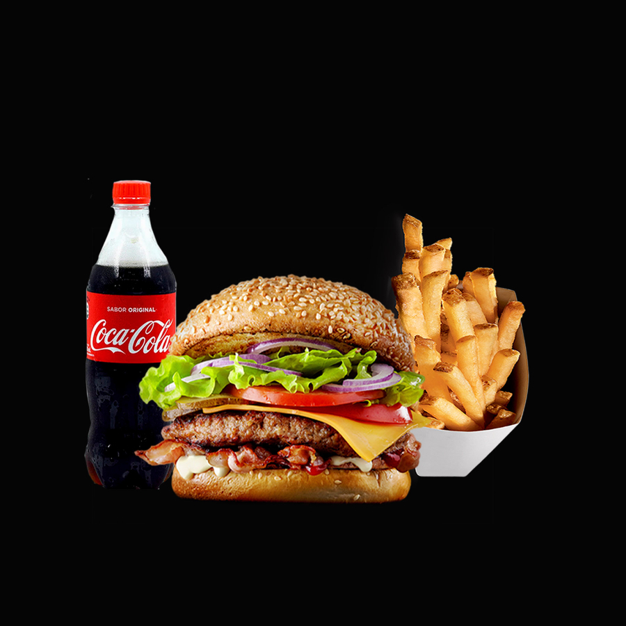 I carne 150g. Sirloin, Tomate, Cebolla, Aderezo, Tocino, Papas + Refresco