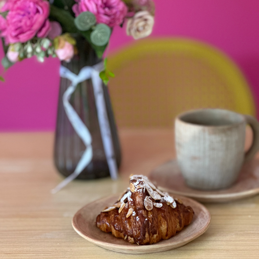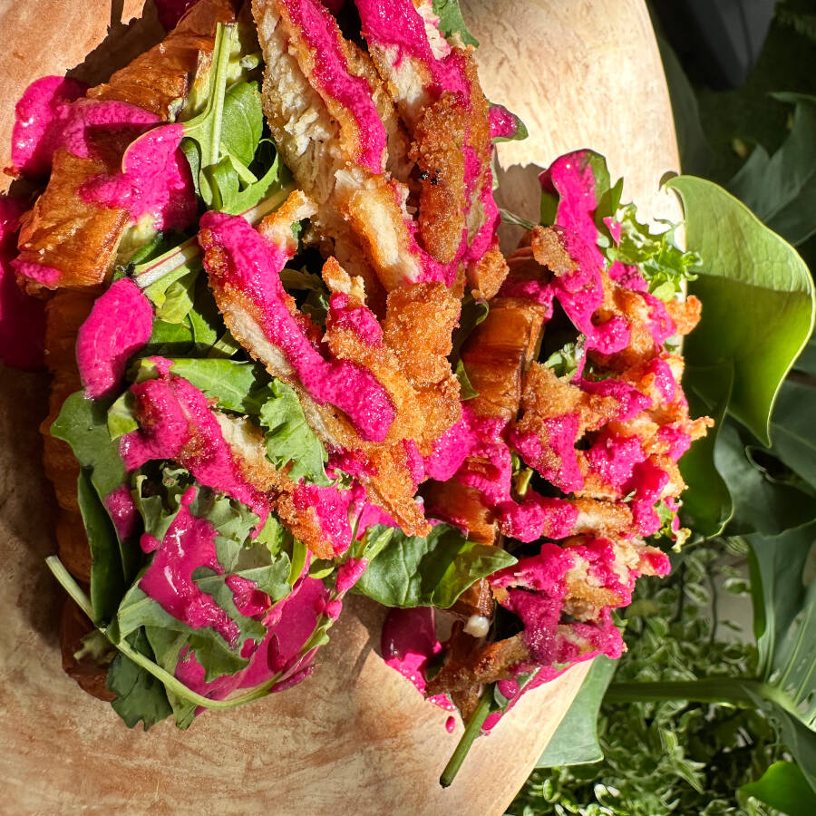 Croissant partido por la mitad, tostado ligeramente con una mantequilla al ajo, por encima una cama de lechuga, espinaca, fajitas de pollo empanizado, coronado con una crema rosa de betabel